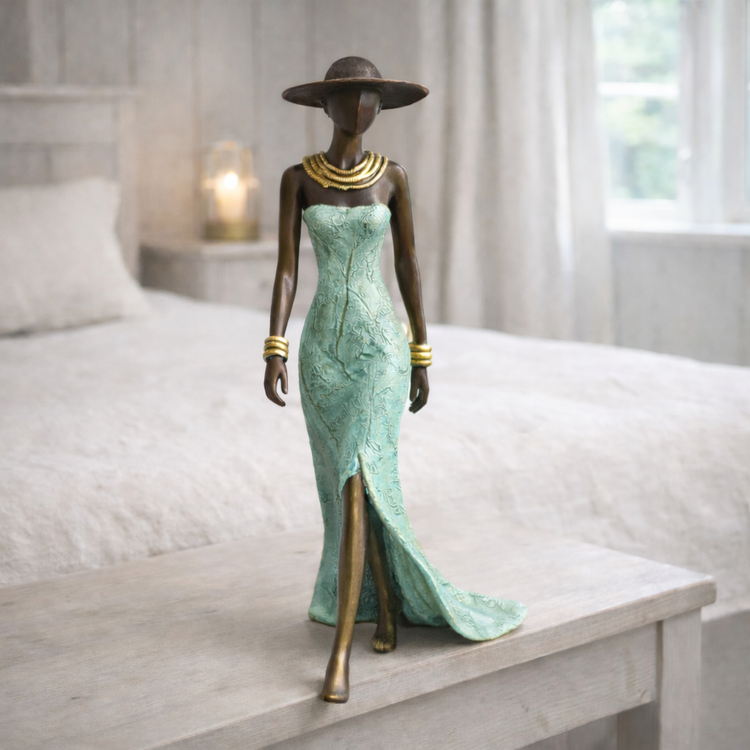 Kvinde med hat – bronzeskulptur af den burkinske kunstner Soré, pastelgrøn kjole, str. 16 cm