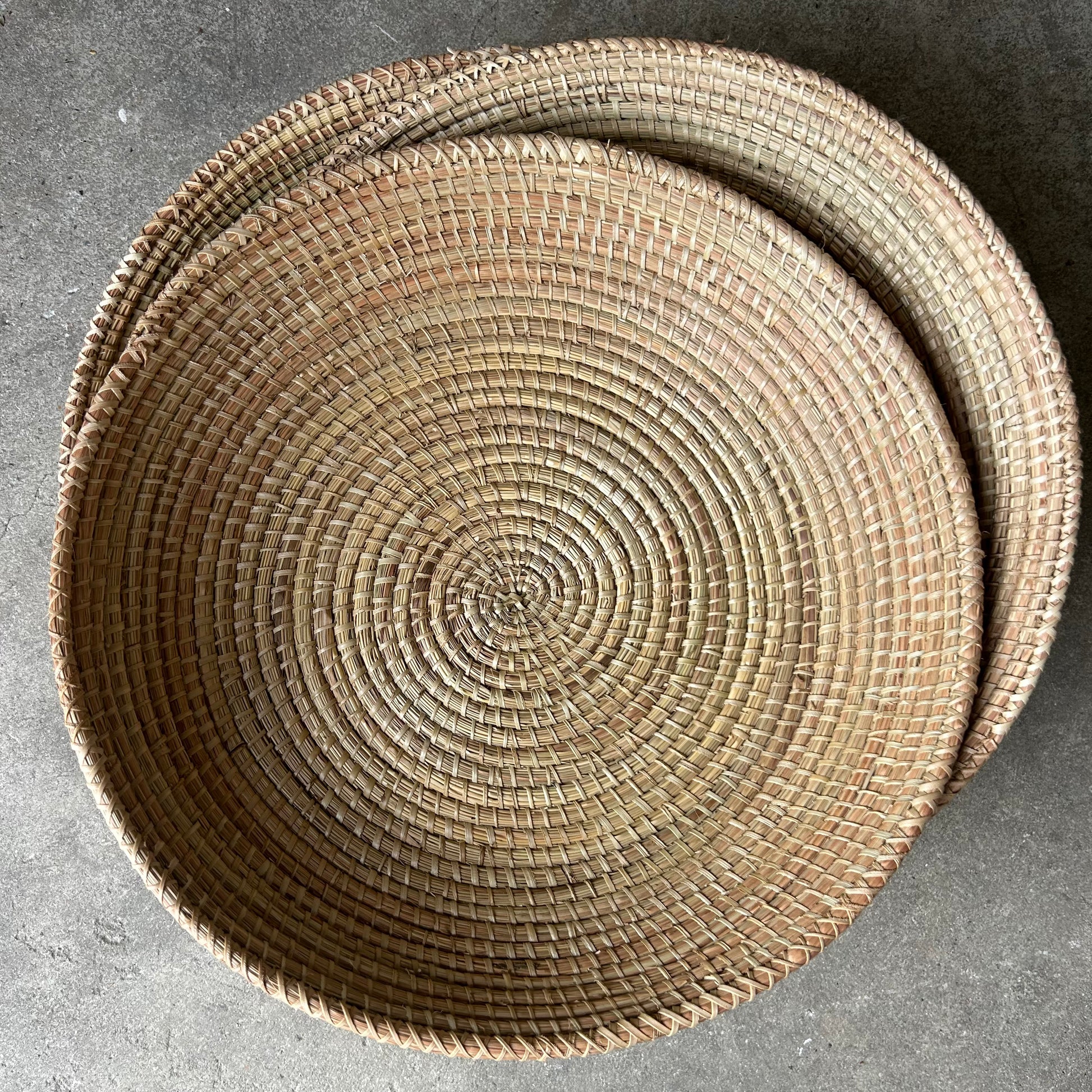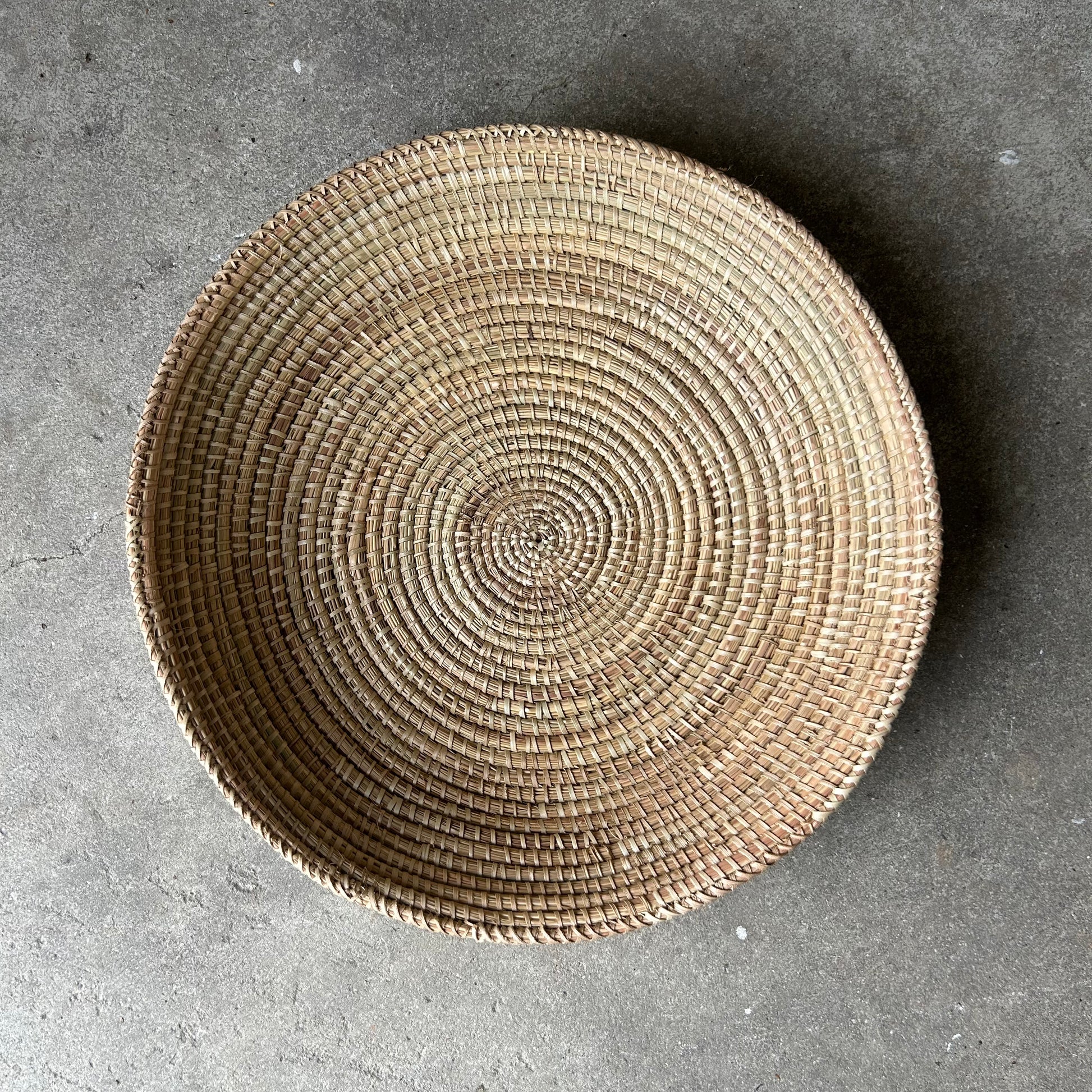 A stylish and simple woven large round bread tray from Senegal. It is woven so firmly and with a flat bottom that it can also be used as a serving tray.