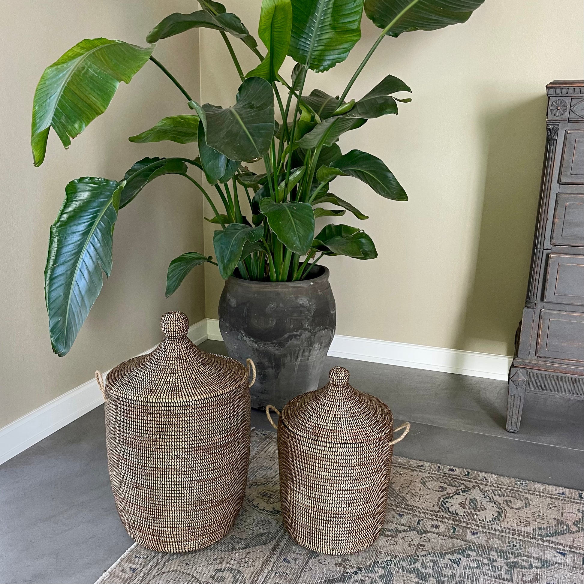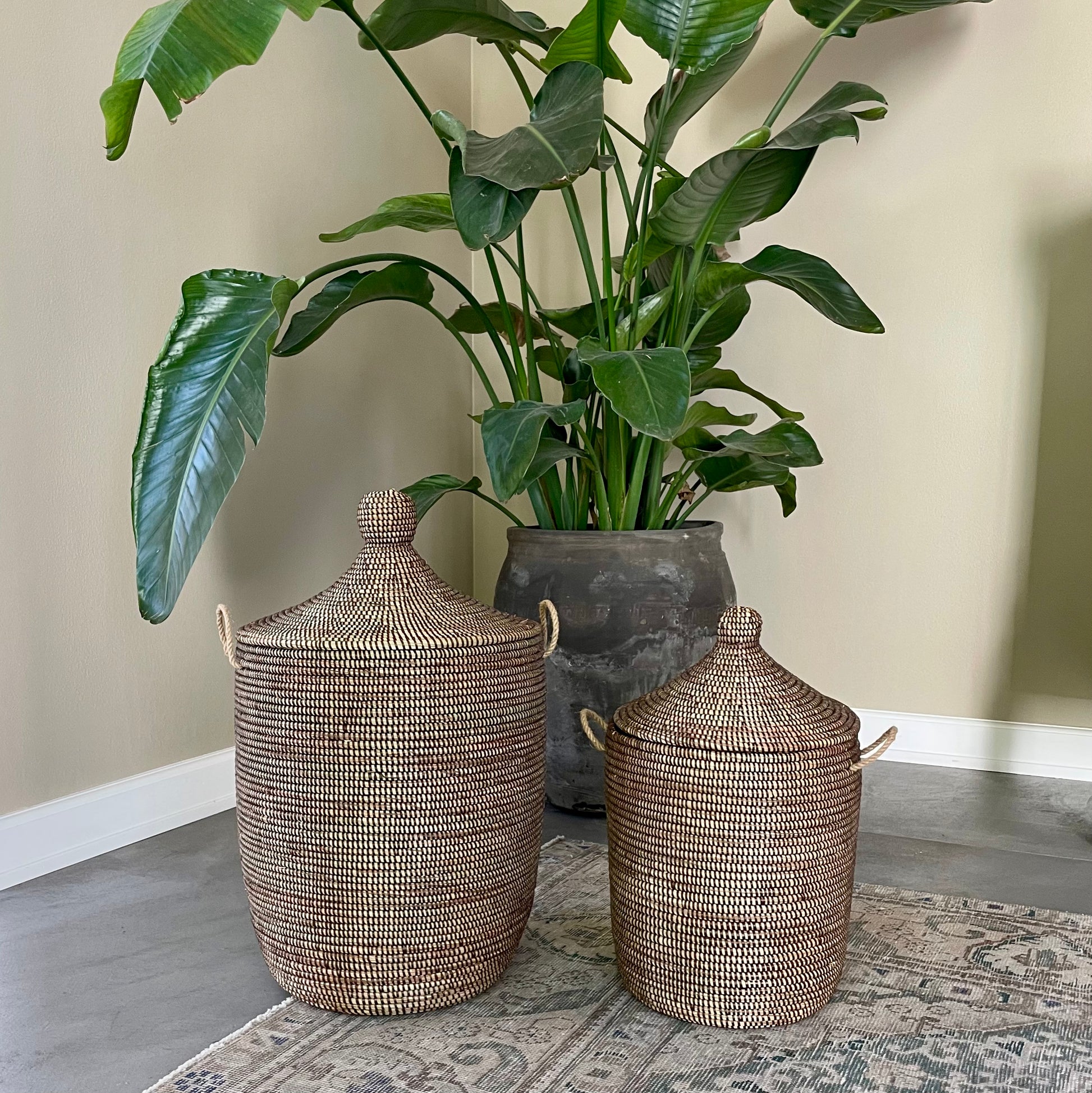 The traditional baskets are woven with a colored plastic thread, creating the beautiful pattern that characterizes Senegalese baskets. The plastic thread is made from recycled plastic.