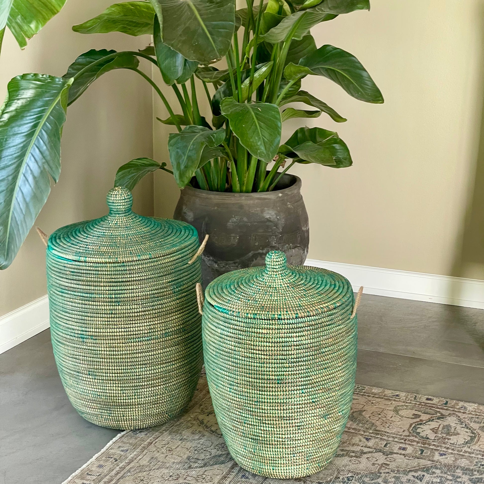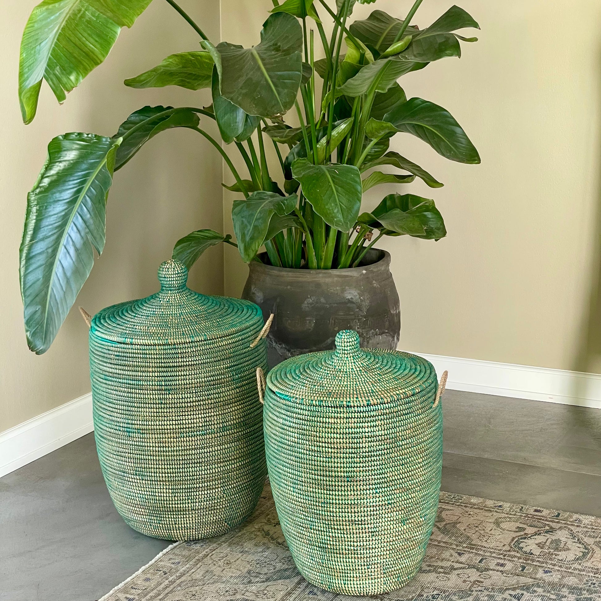 Sky blue laundry basket, hand woven with Senegal lid. Fair Trade