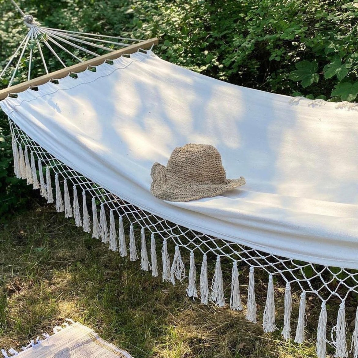 The hammock is made of cotton fabric that is soft and suitable for outdoor use.