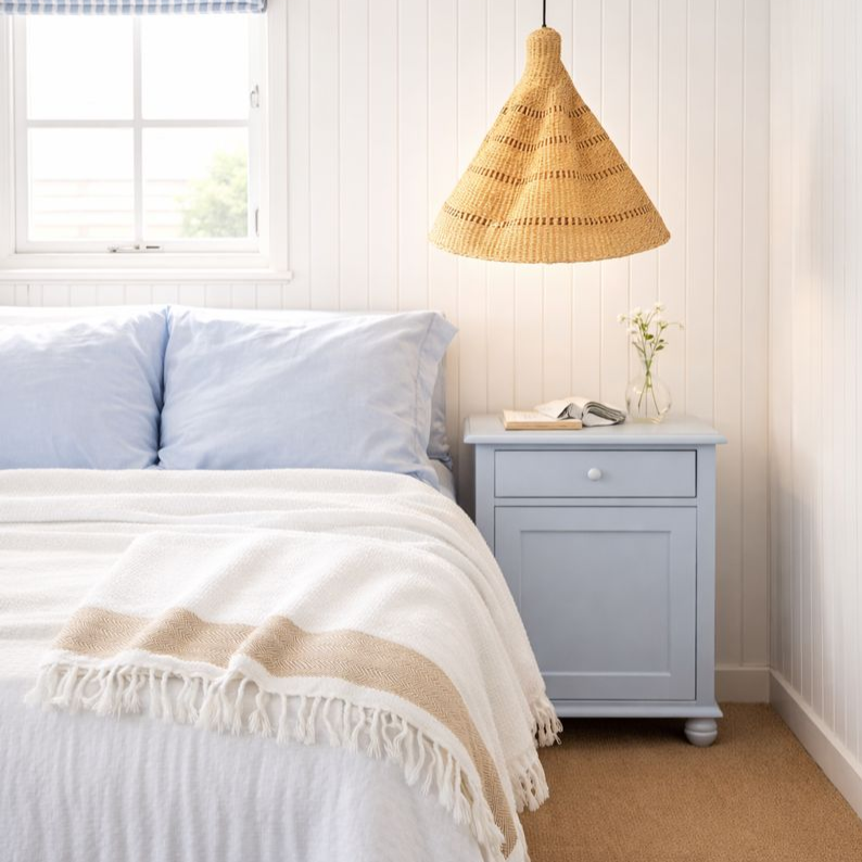 The classic striped design in natural and muted color tones gives a fresh and summery look that suits any beach style.