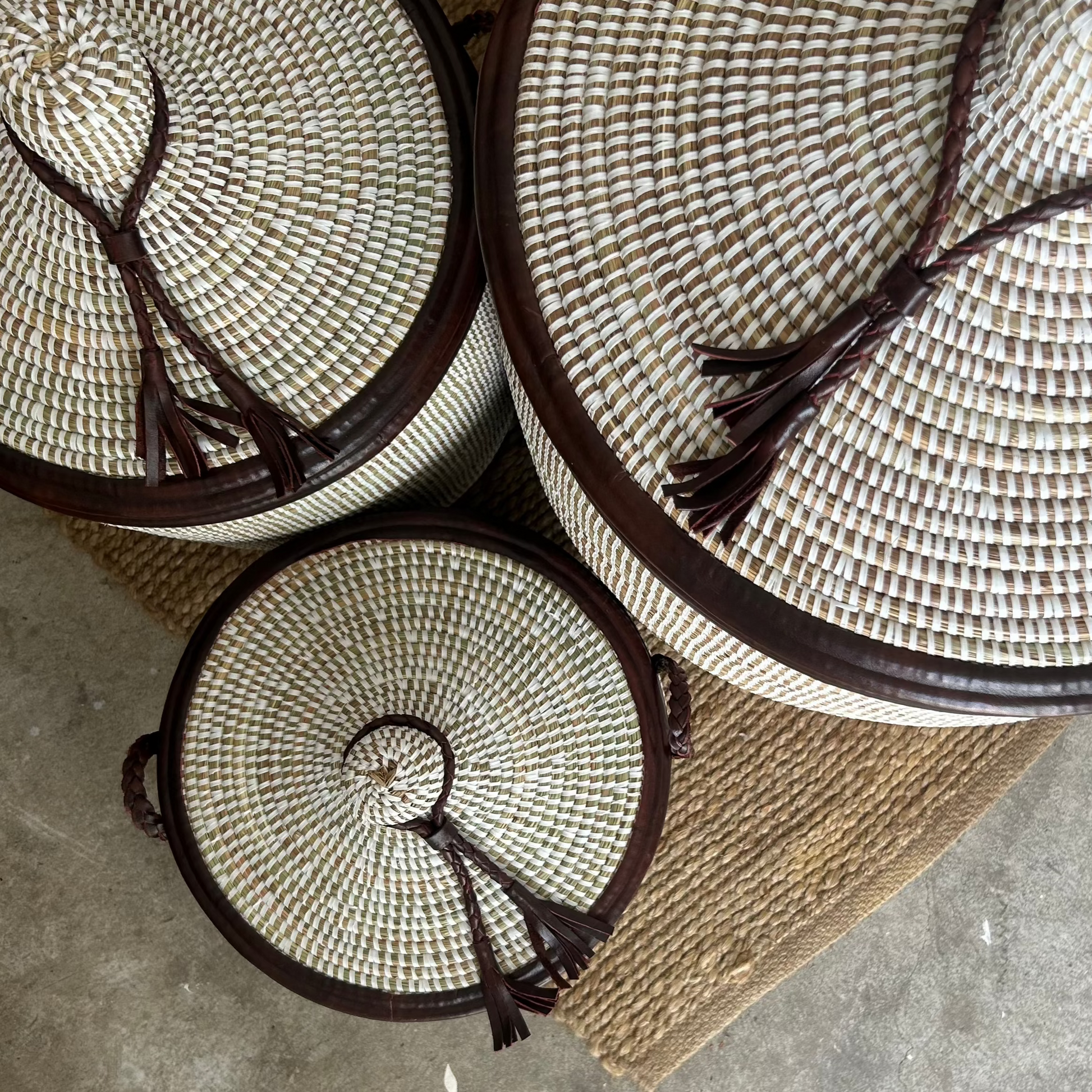 White laundry basket with leather details, hand braided with Senegal lid