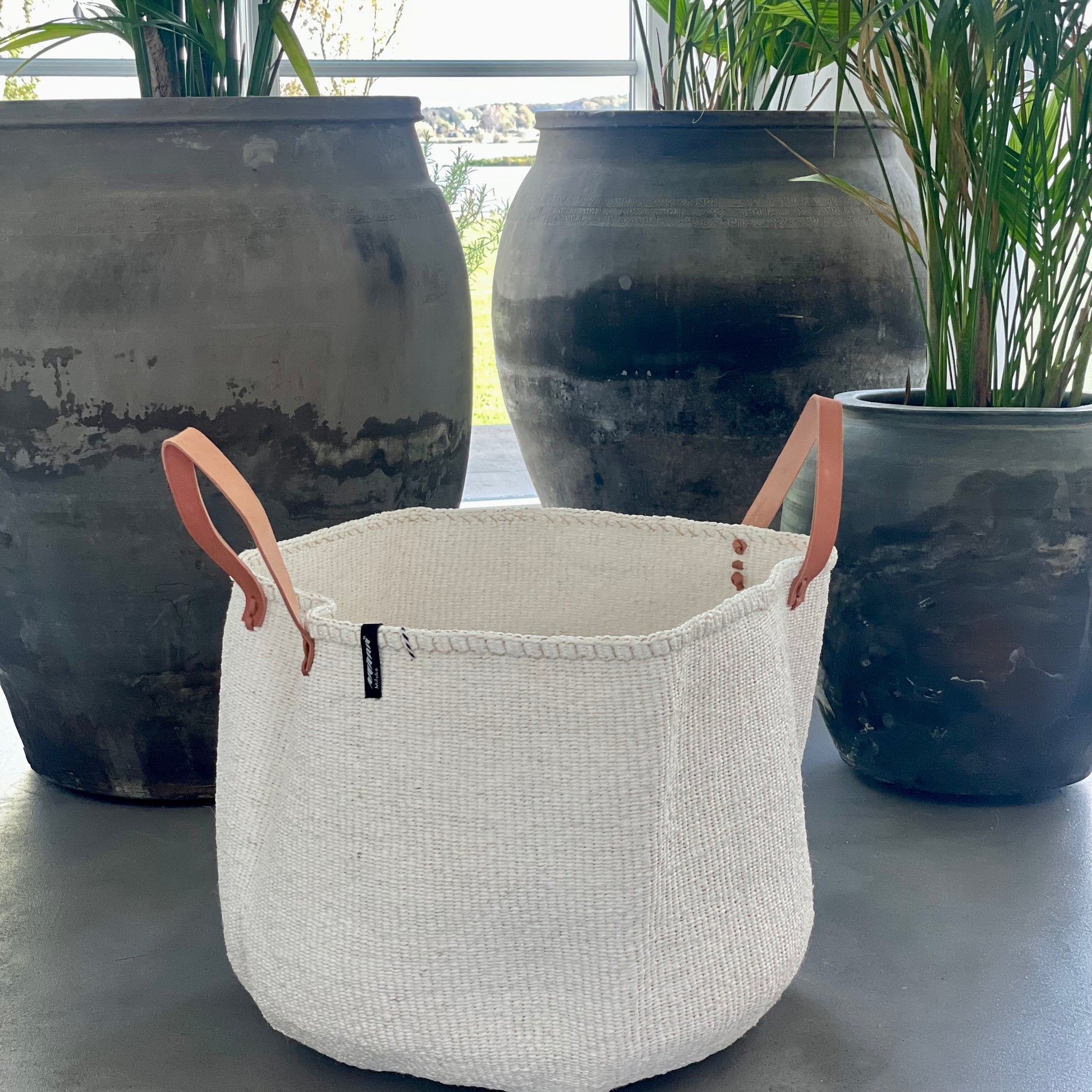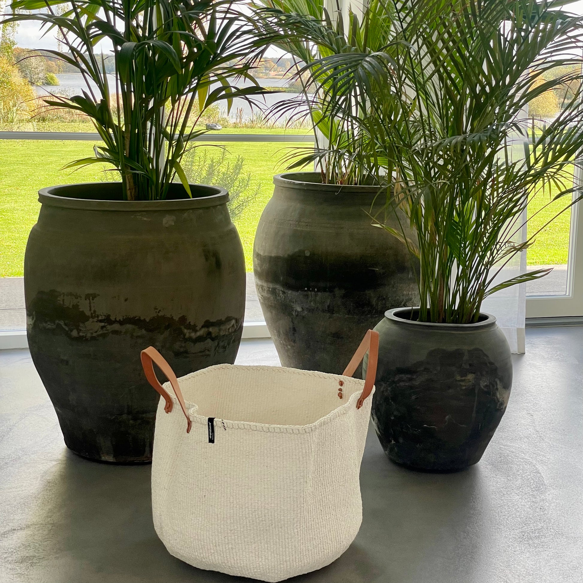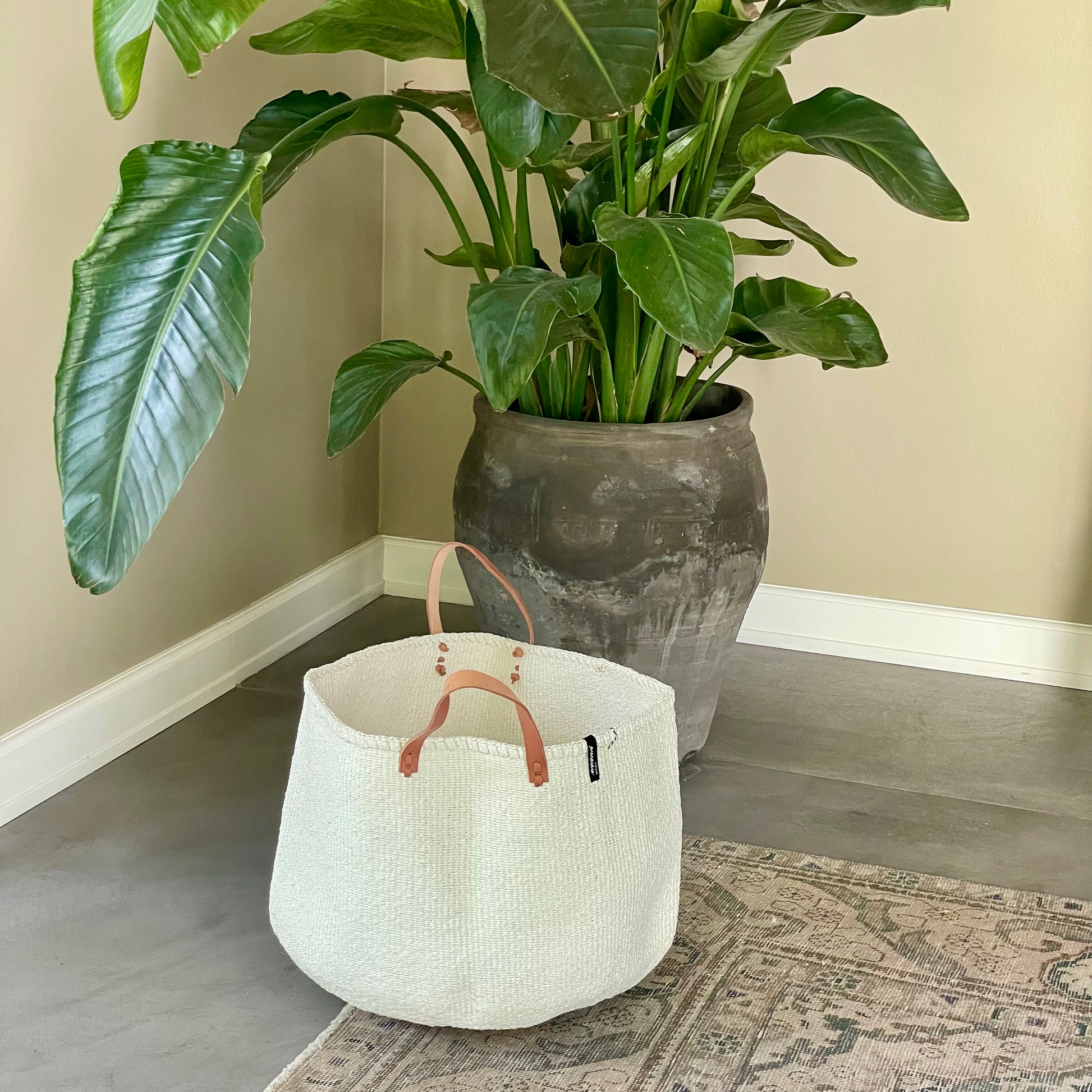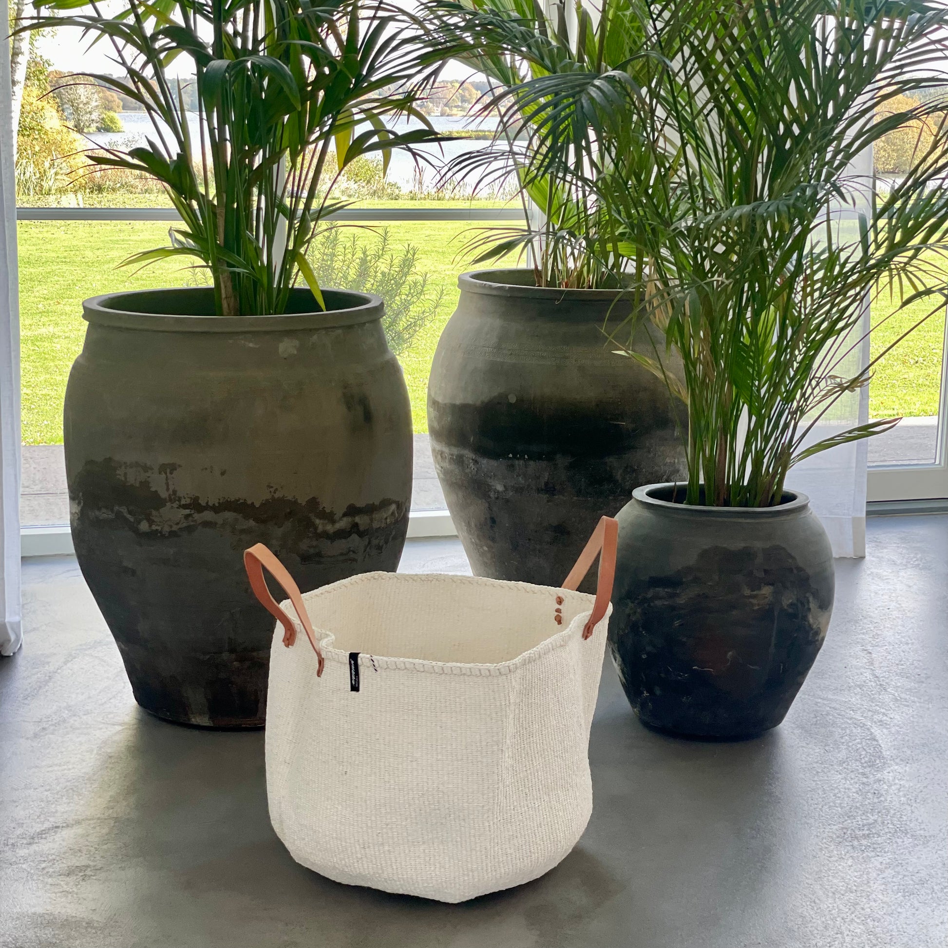 Den håndlavede hvide gulvkurv kan bruges både inde og ude. Den er flettet af så meget genanvendt plast som muligt, men er stadig fødevaresikker og nem at rengøre med blot vand. Hvert produkt bærer navnet på den person, der har lavet det.
