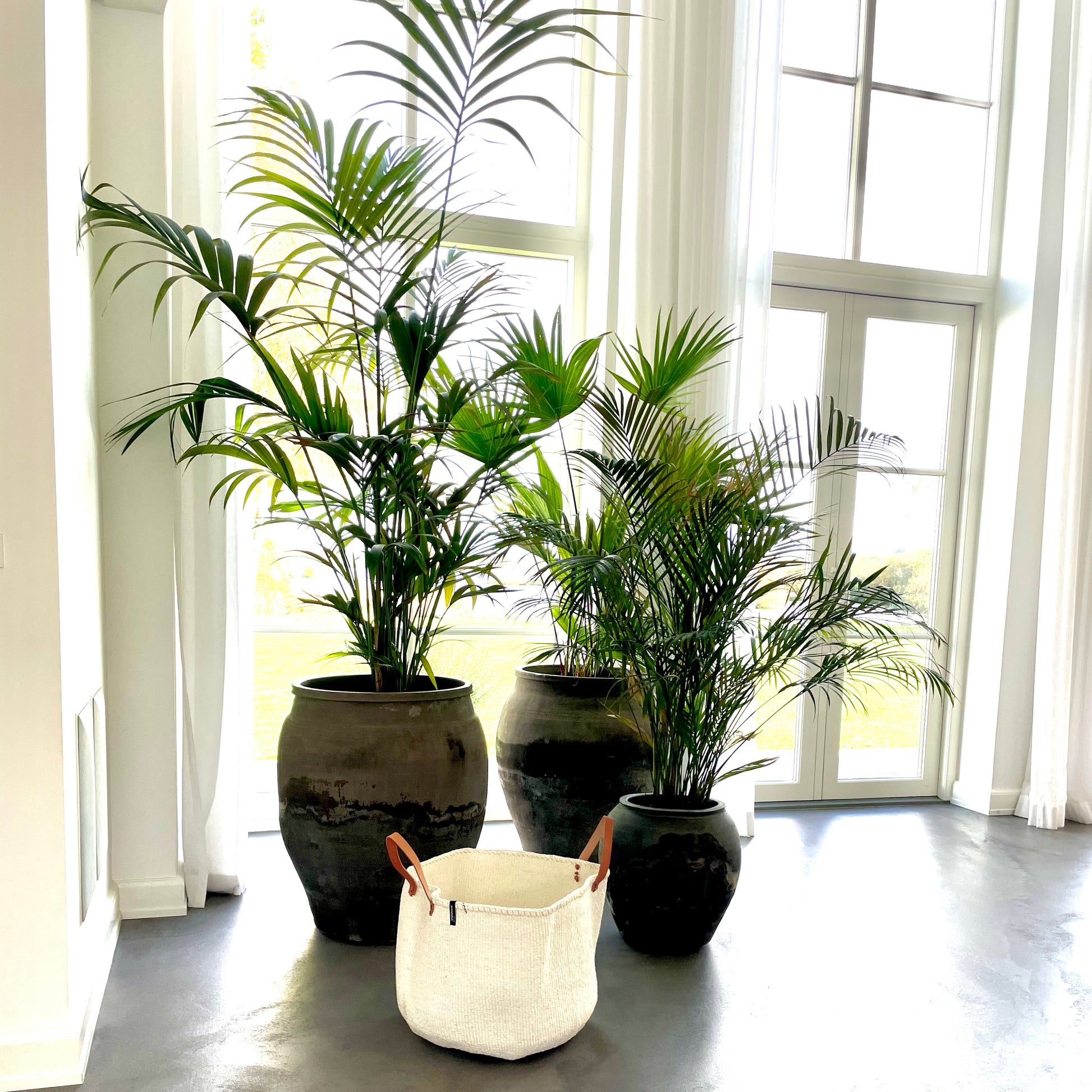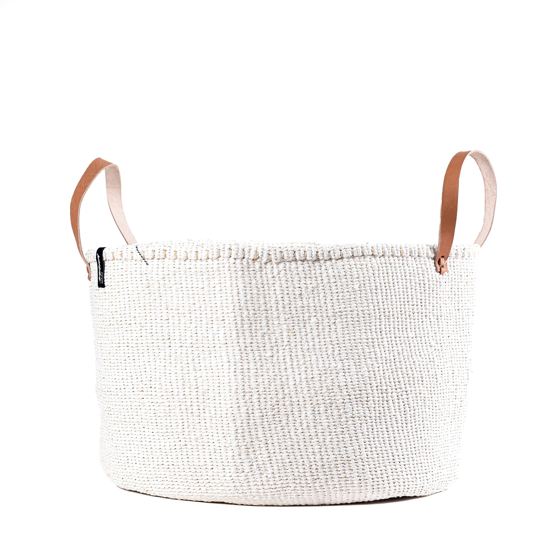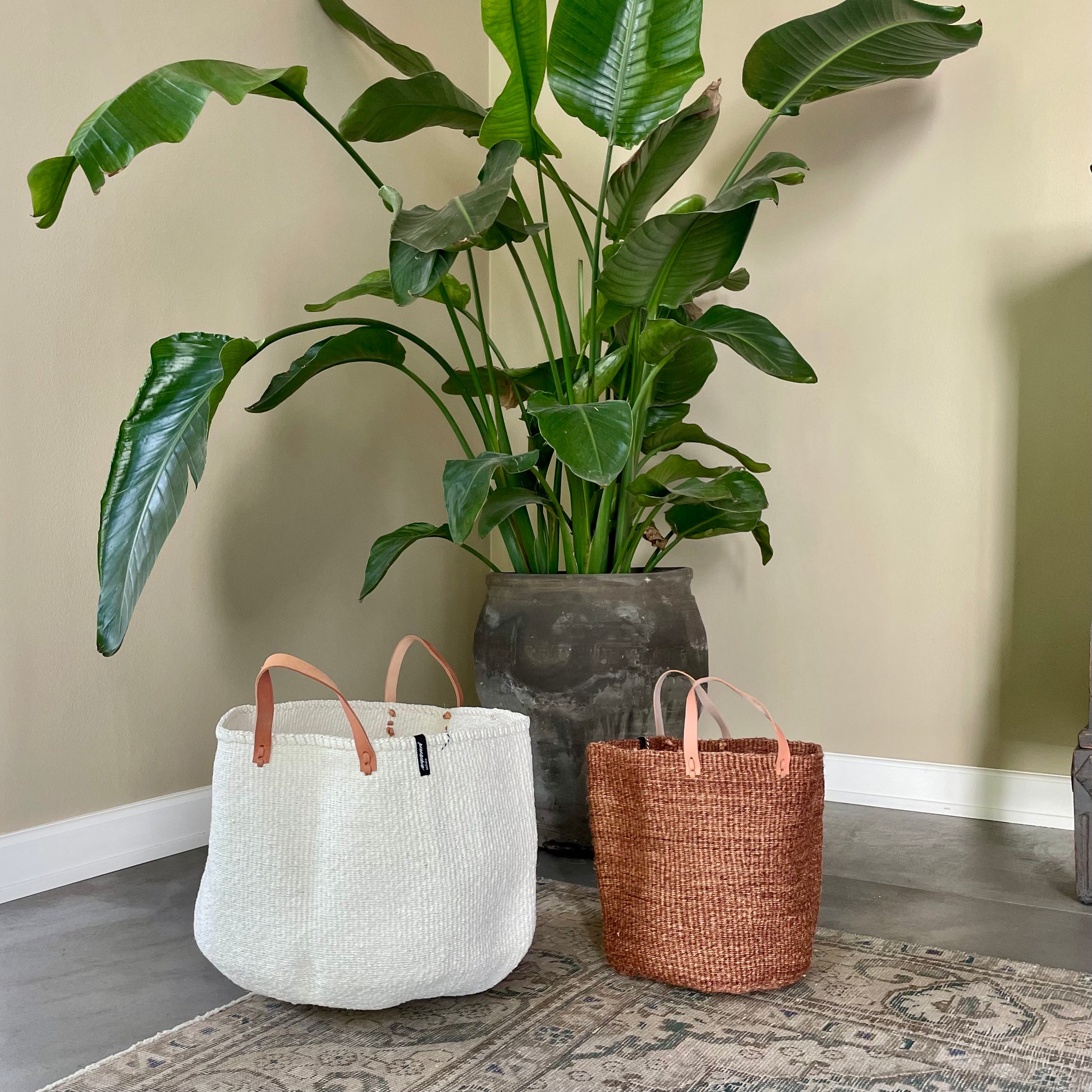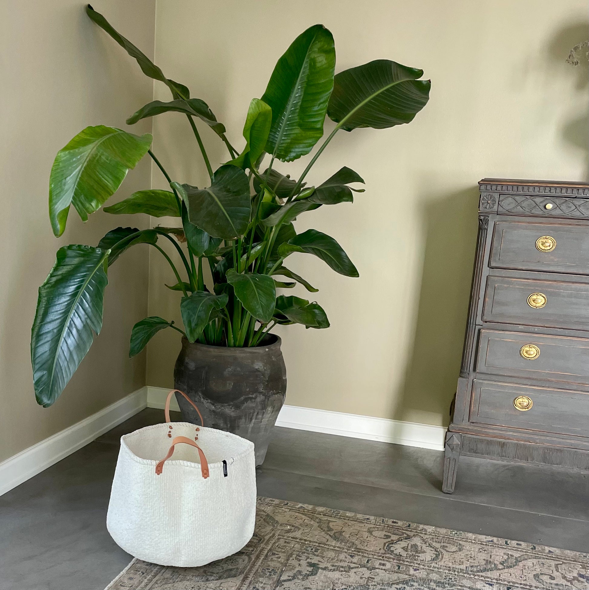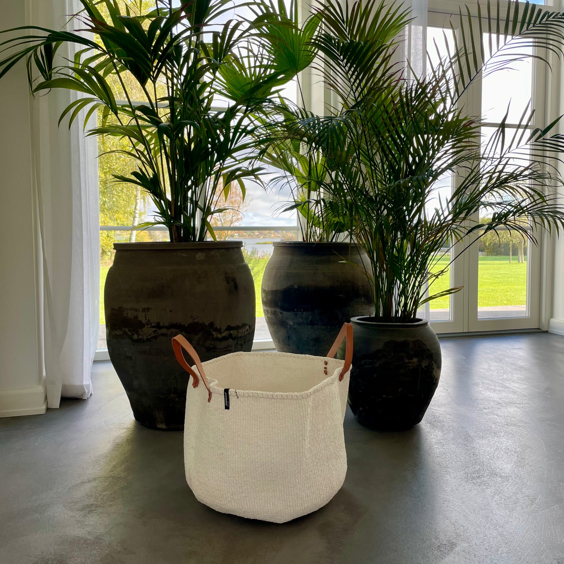 Den håndlavede hvide gulvkurv kan bruges både inde og ude. Den er flettet af så meget genanvendt plast som muligt, men er stadig fødevaresikker og nem at rengøre med blot vand. Hvert produkt bærer navnet på den person, der har lavet det.