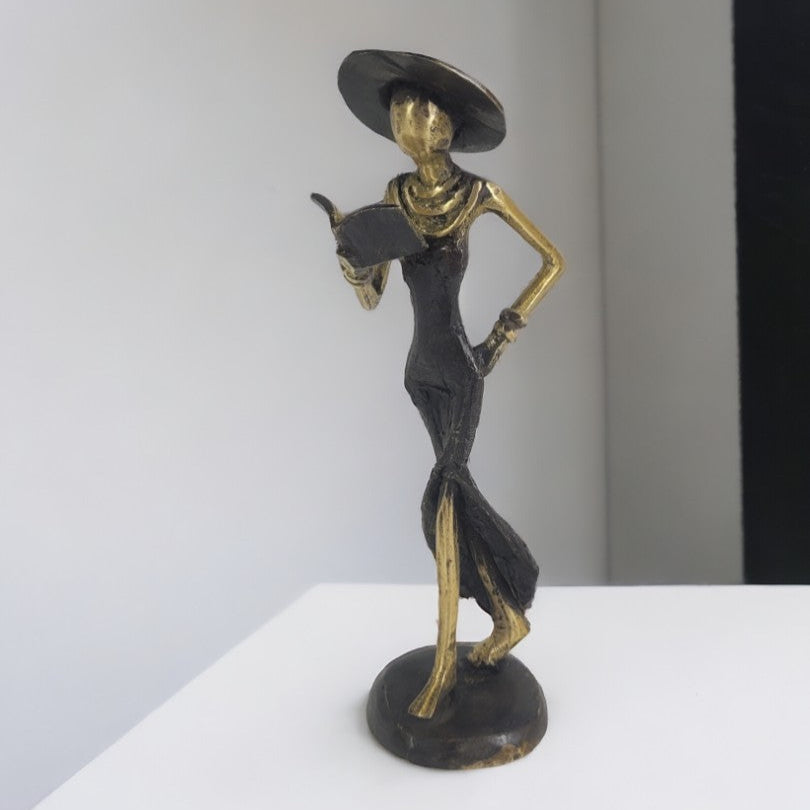 Kvinde med bog og hat – messingskulptur, sort kjole, str. 16 cm
