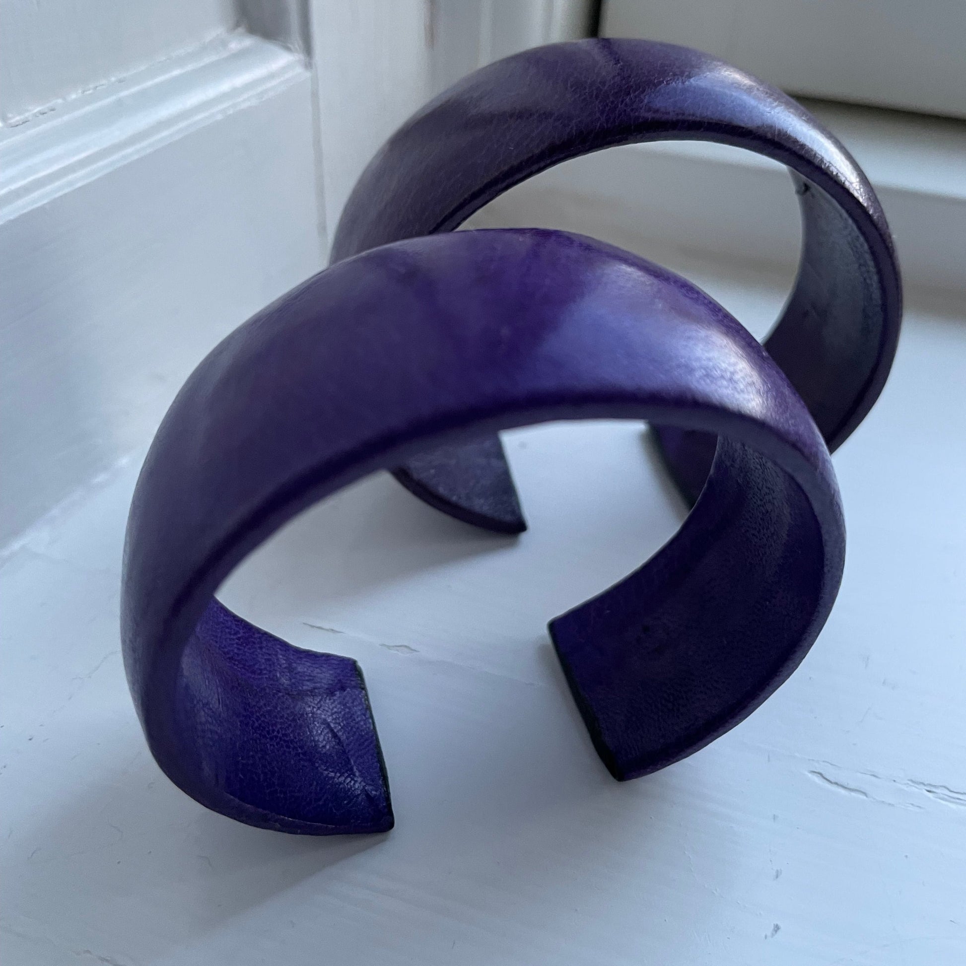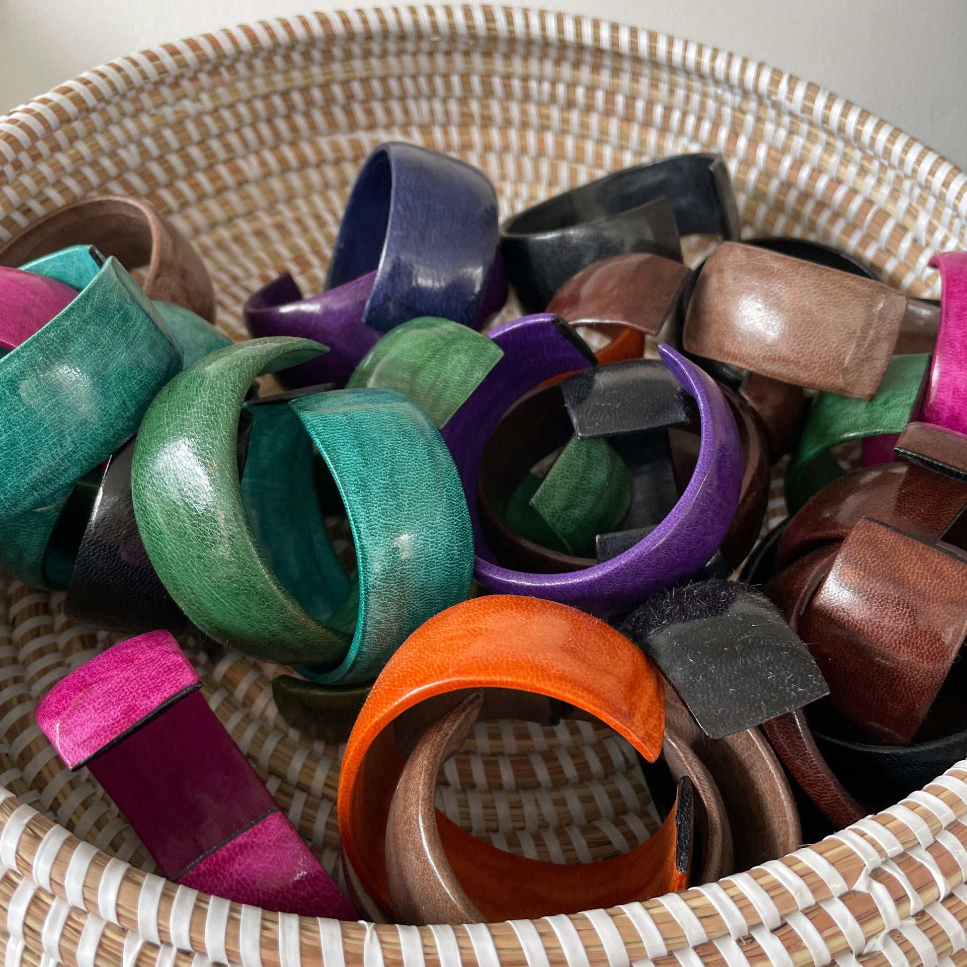 Beautiful handmade leather bracelets from Burkina Faso in all the colors of the rainbow. The bracelets are approx. 3-4 cm wide and have a flexible opening for the arm.
