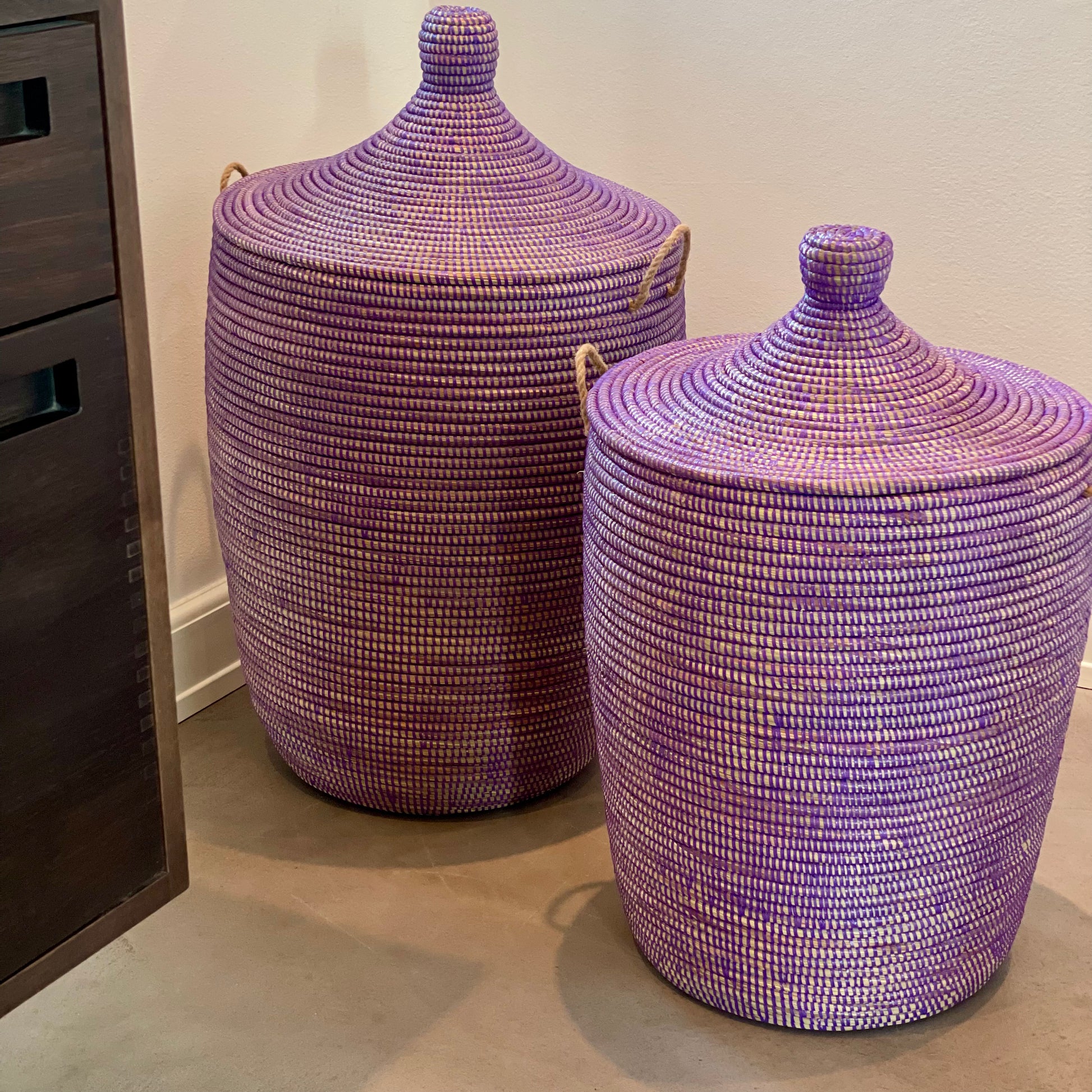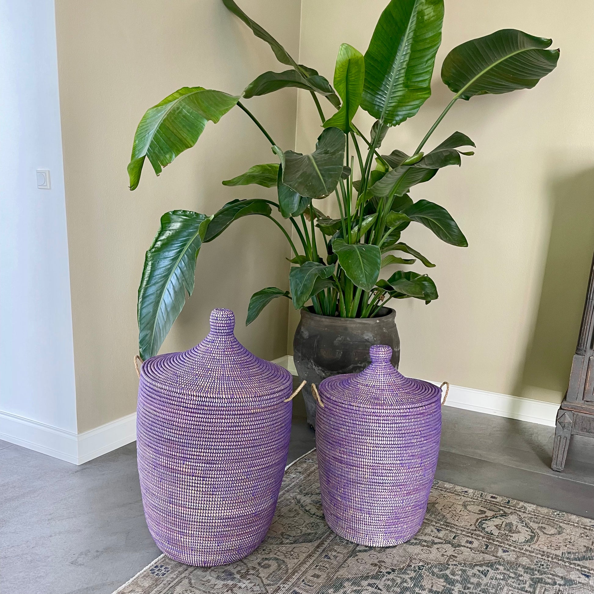 The traditional baskets are woven with a colored plastic thread, creating the beautiful pattern that characterizes Senegalese baskets. The plastic thread is made from recycled plastic.