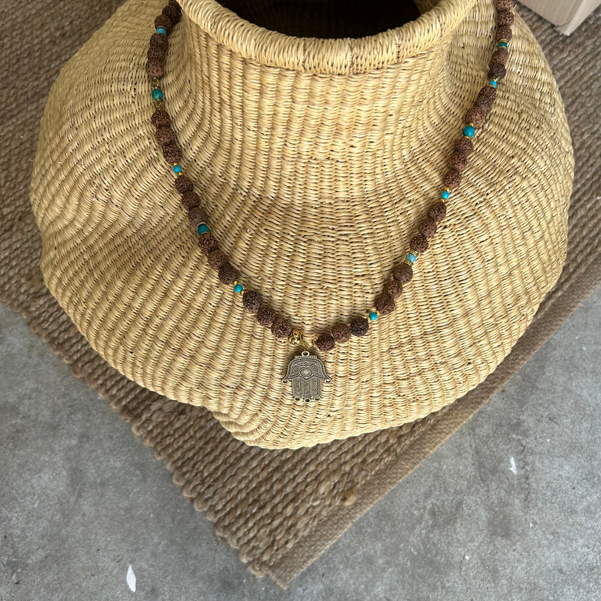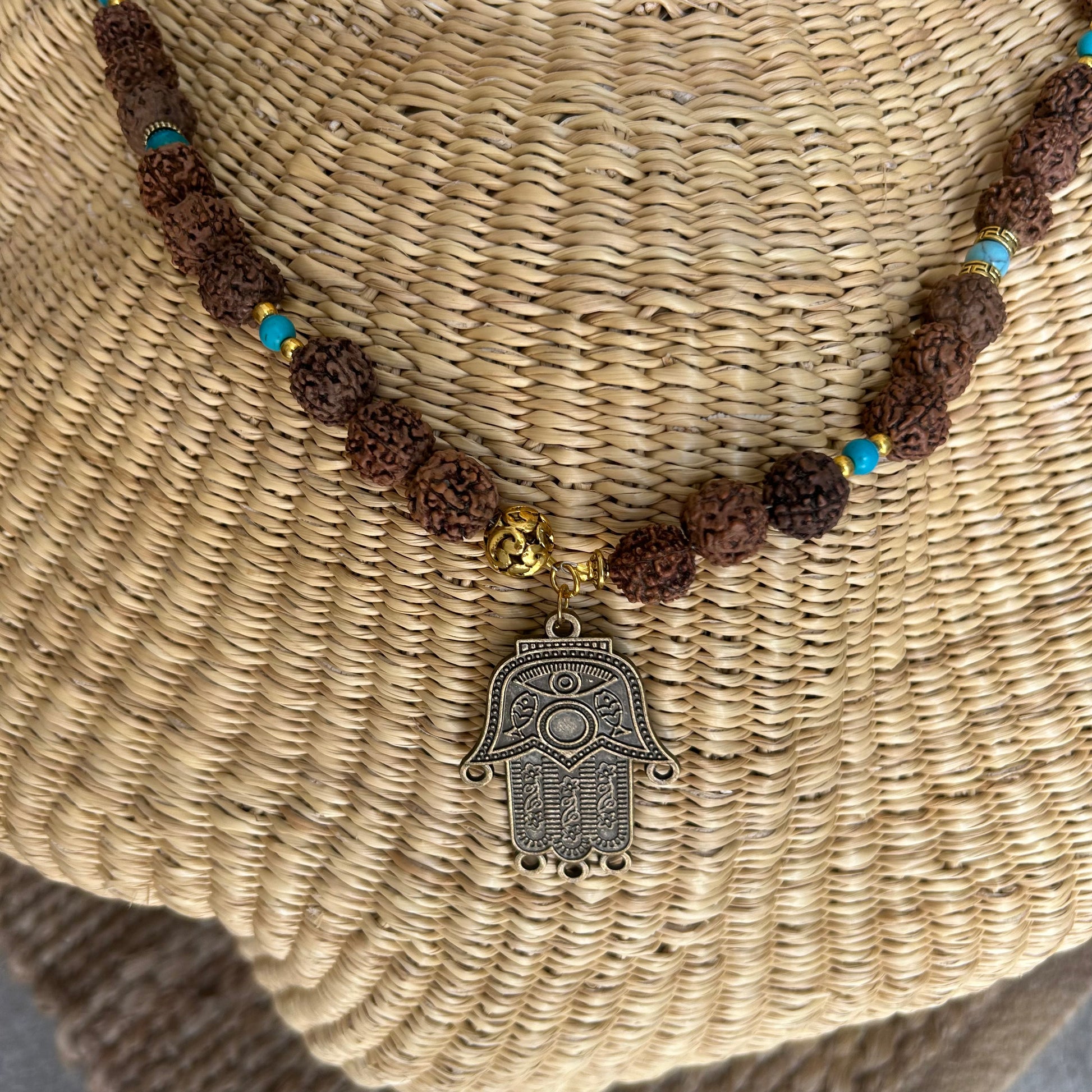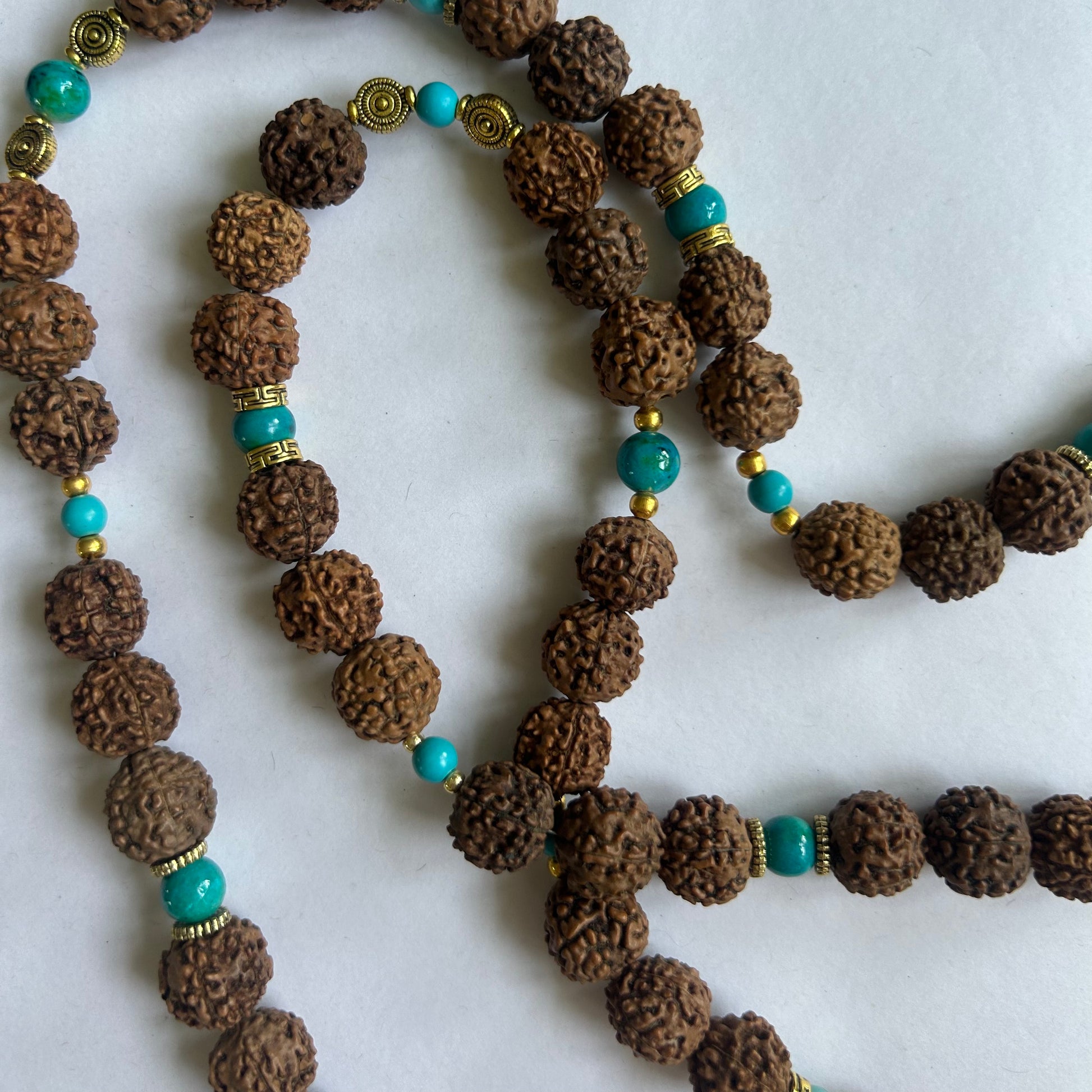A beautiful mala chain with 108 beads in bean beads, turquoise beads, gold plated links and unique pendant.