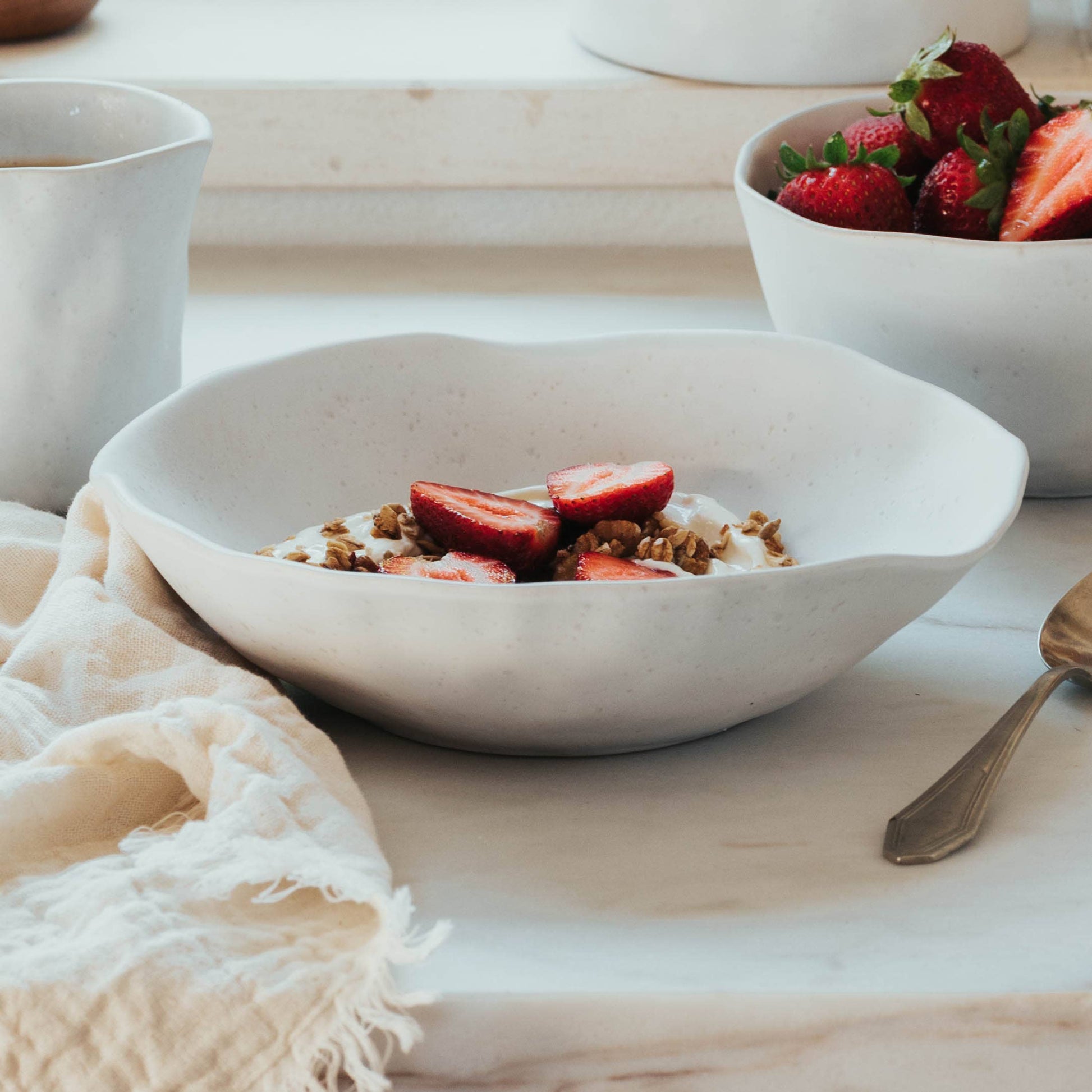 Hver skål er omhyggeligt håndlavet og bærer sit eget unikke udtryk. Det gør den ikke bare til en praktisk del af din borddækning, men også til et lille kunstværk i sig selv.