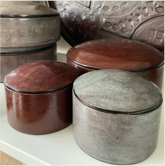 The most beautiful Fair Trade handmade Tuareg leather boxes from Burkina Faso. The decorative boxes are available in 2 sizes and lots of colors. Use them for decoration, jewelry boxes, keys, small gadgets, cotton pads or much more.