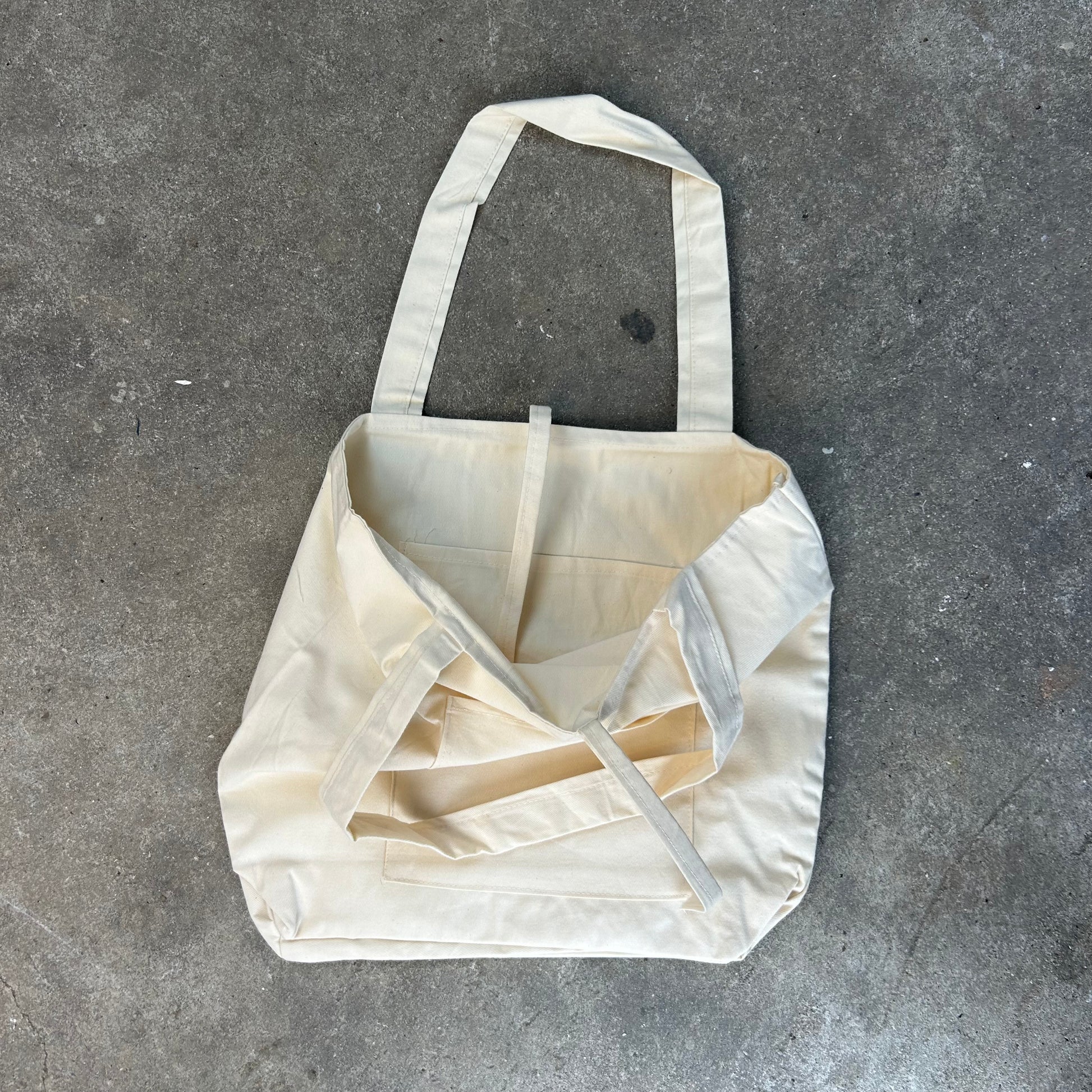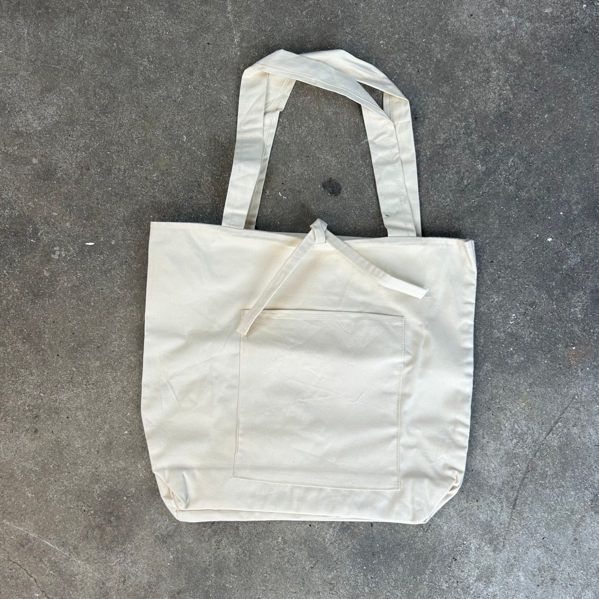The bag has a large pocket on the front and inside and a tie to close the bag. It is available in three colors.