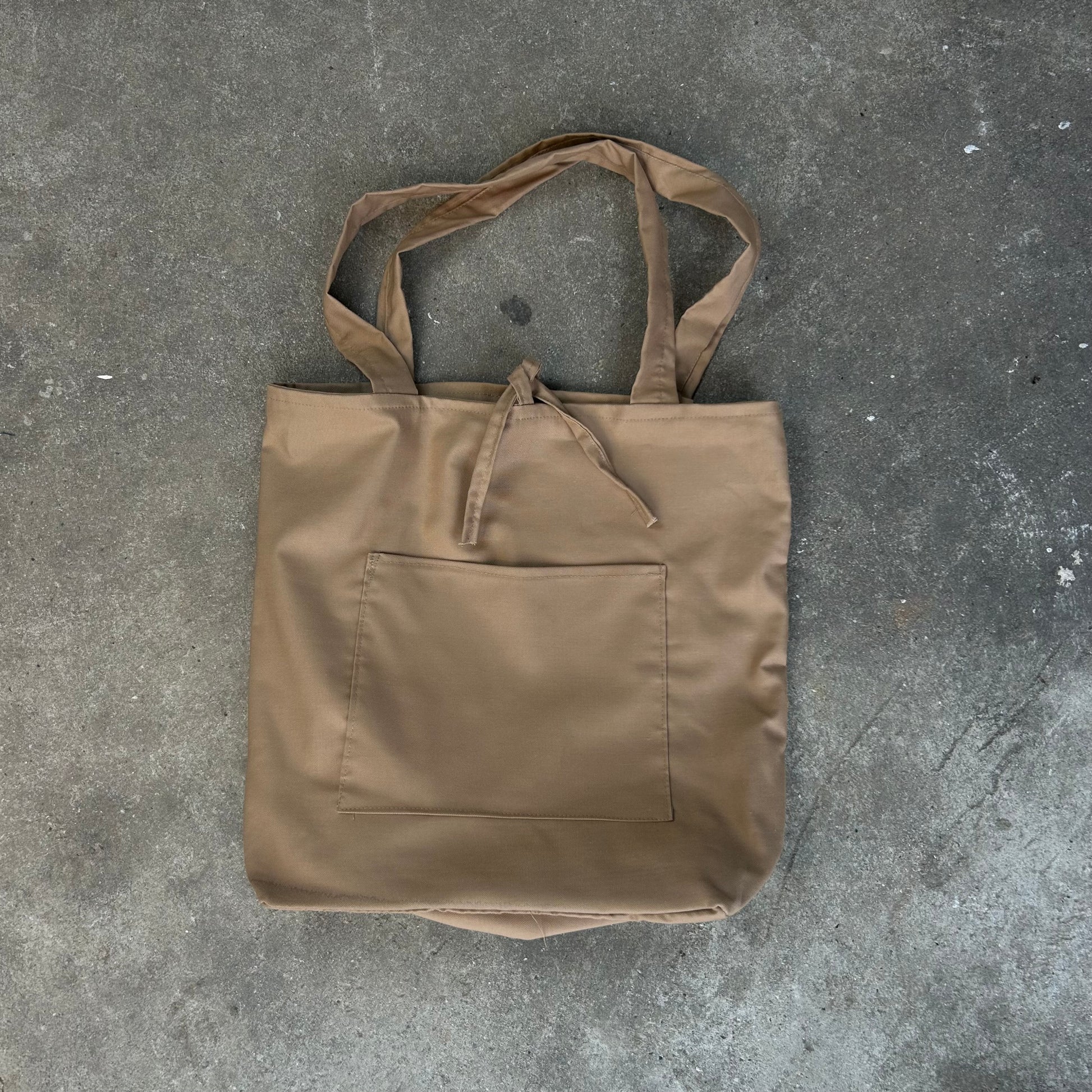 The bag has a large pocket on the front and inside and a tie to close the bag. It is available in three colors.