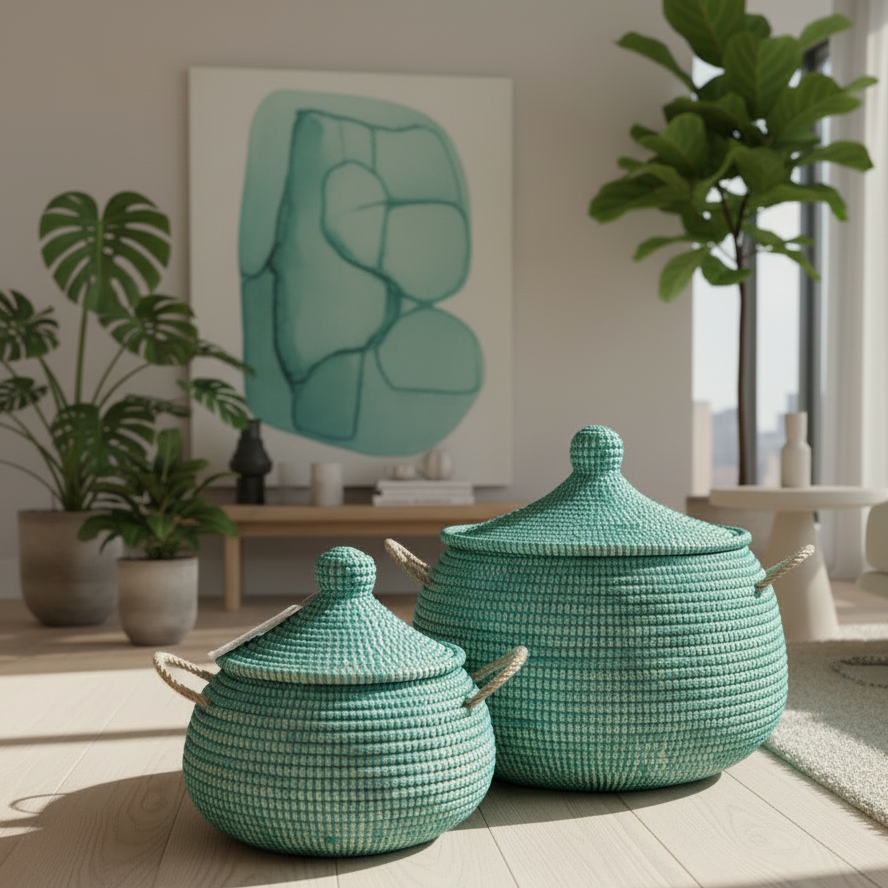 Buttede ball baskets (Ndaa) med låg, mørk grøn. Fair Trade, Senegal