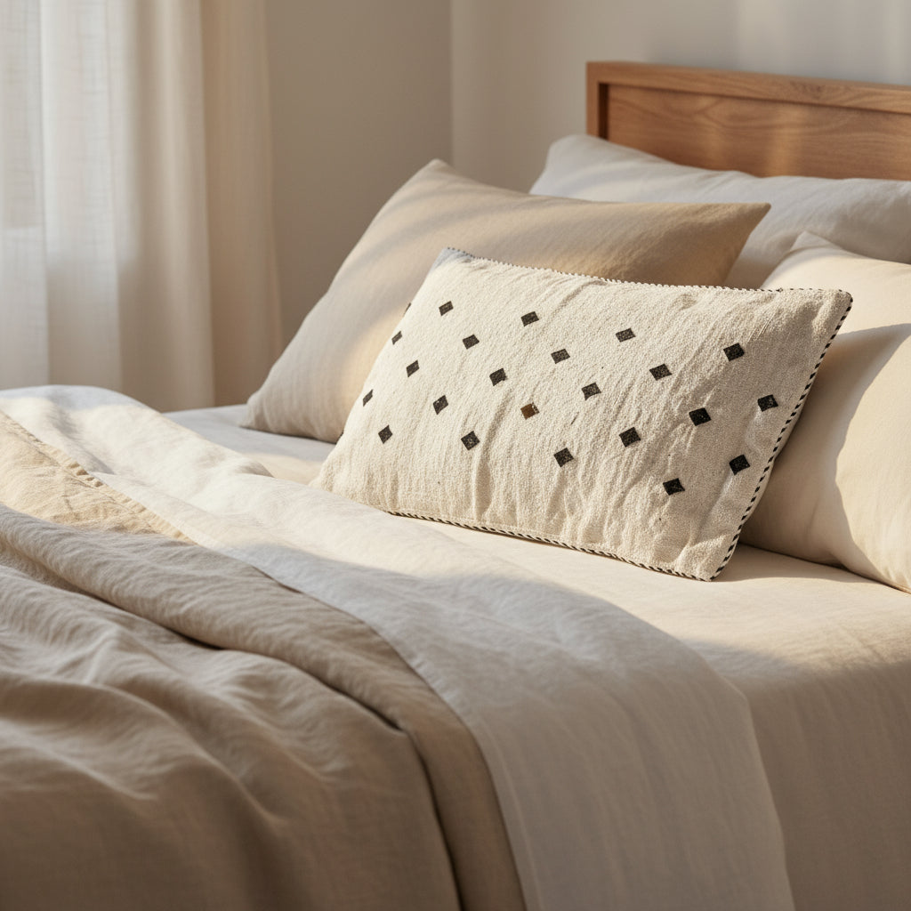 På besøg hos et lille berber-væveri for foden af Atlasbjergene fandt vi disse helt unikke pudebetræk fremstillet i uld. Alle puderne er unikke og upcyclet fra bl.a. sofa-tæpper, væg-tæpper m.m. Det er en smuk måde at genbruge materialerne på og det gør puderne helt unikke med hver sin historie og uperfekthed.