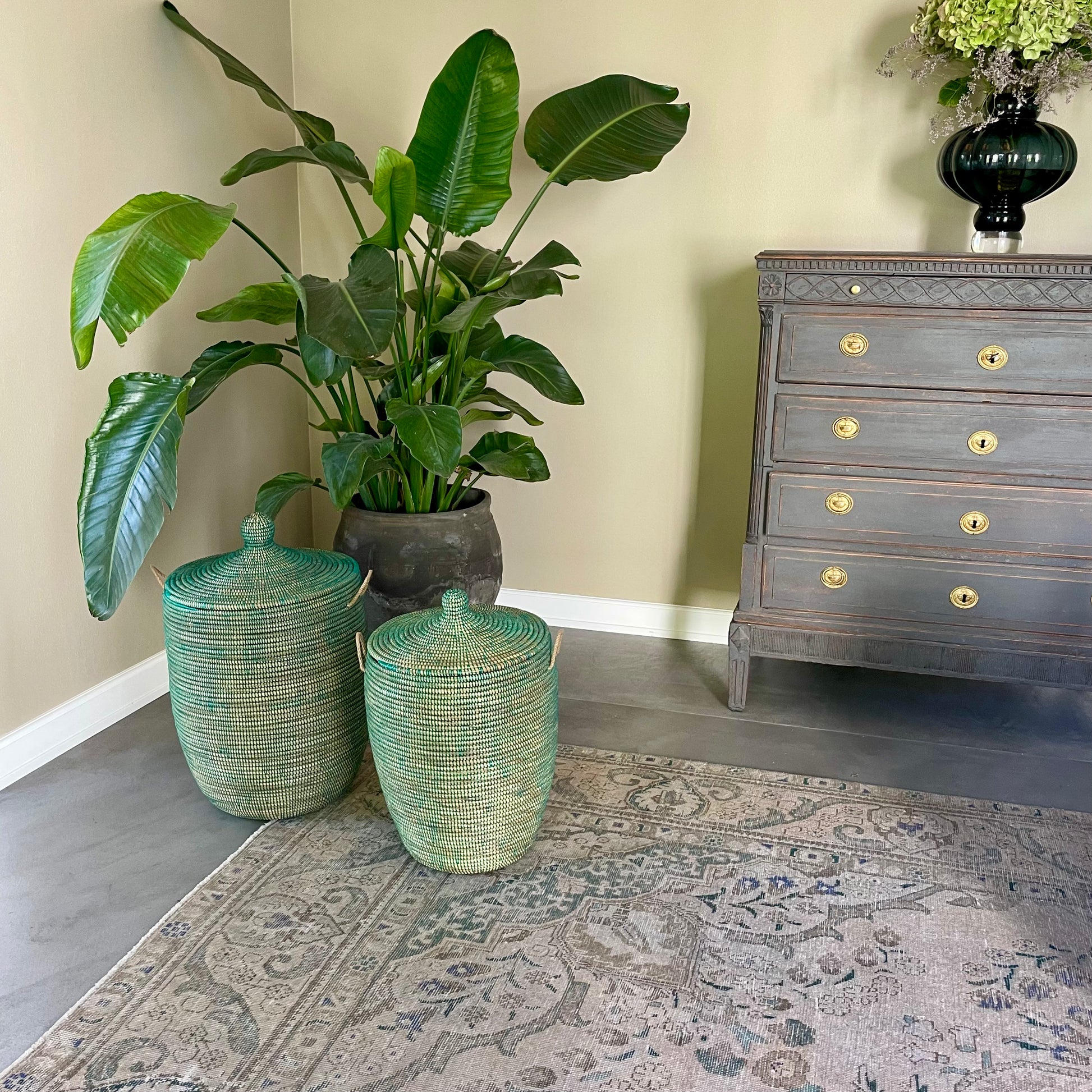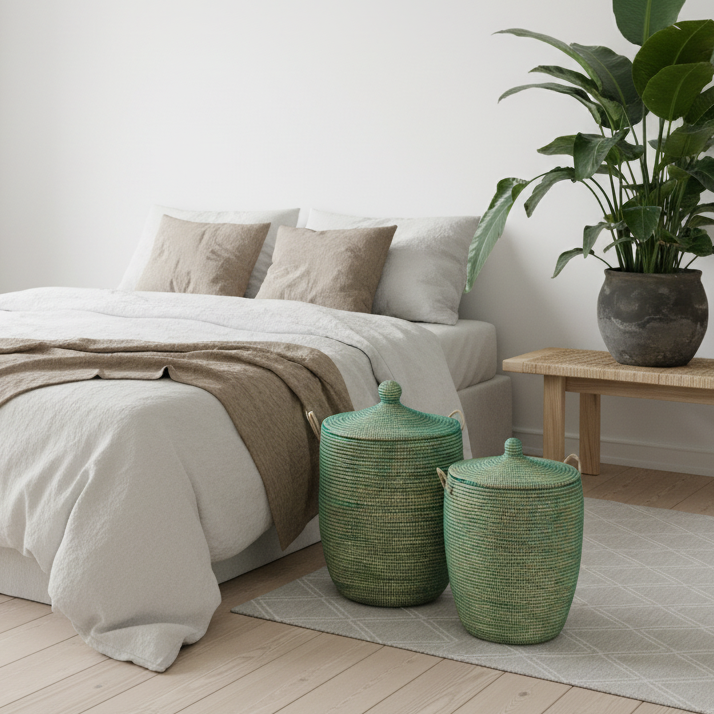 Grøn vasketøjskurv, håndflettet med Senegal-låg. Fair Trade
