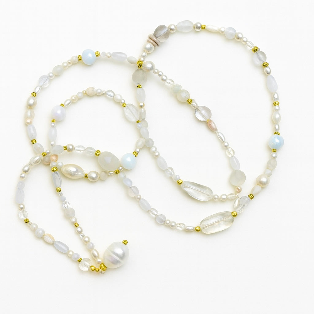 De flotteste unika halskæder i smukke lyse cremefarver. Perlerne er et mix af alverdens perler, krystaller og halvædelsten. Der er ikke 2 halskæder der er ens.