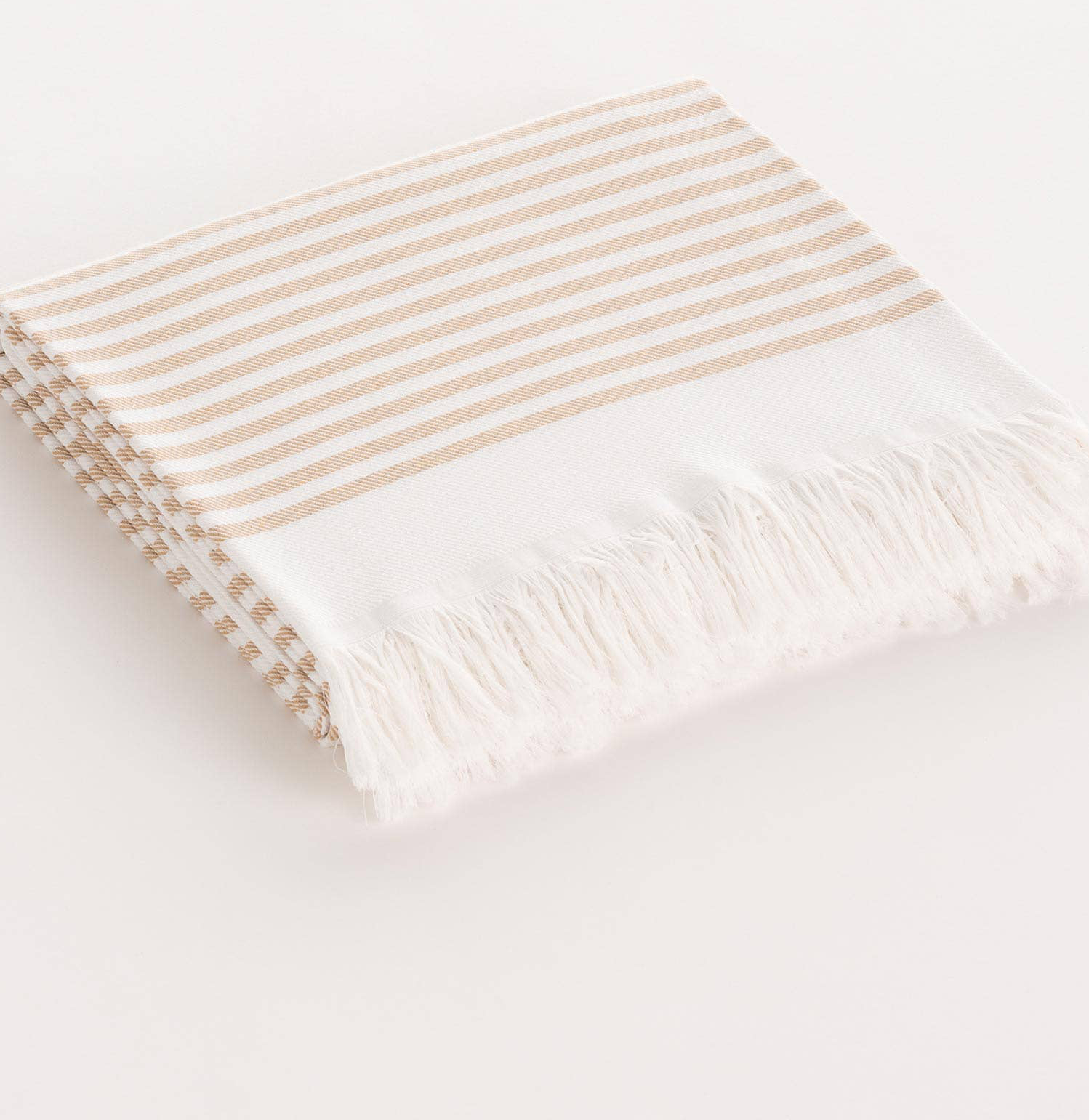 Let og behagelig i en blanding af 60% bomuld og 40% polyester – kombinerer komfort, hurtig tørring og nem anvendelse som både håndklæde og sarong. Det klassiske stribede design i naturlige farver giver et frisk, sommerligt look til stranden eller poolen.