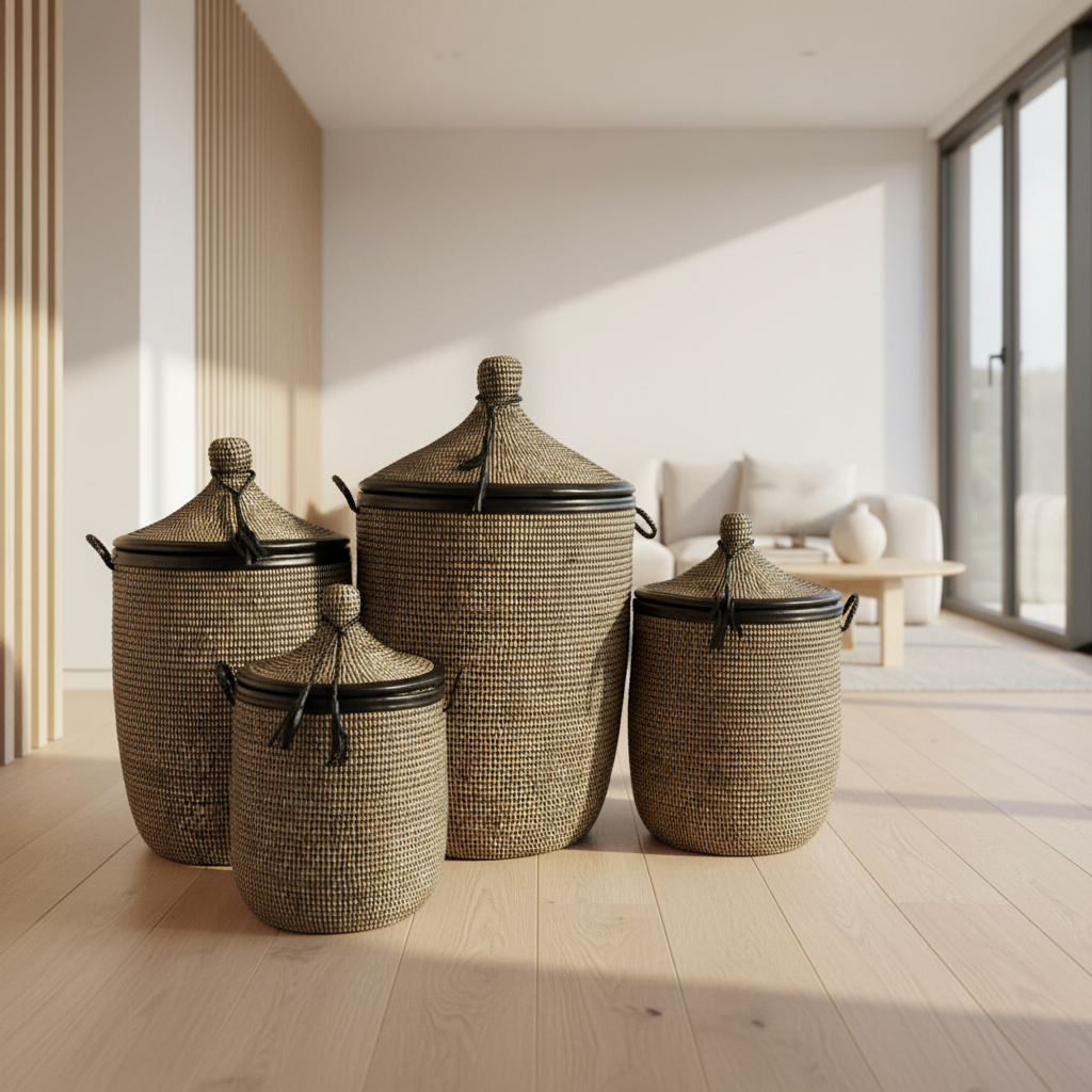 De smukkeste vævede Fair Trade kurve fra Senegal. Alle kurve er håndlavede og kan derfor variere lidt i størrelse, farver og mønster.