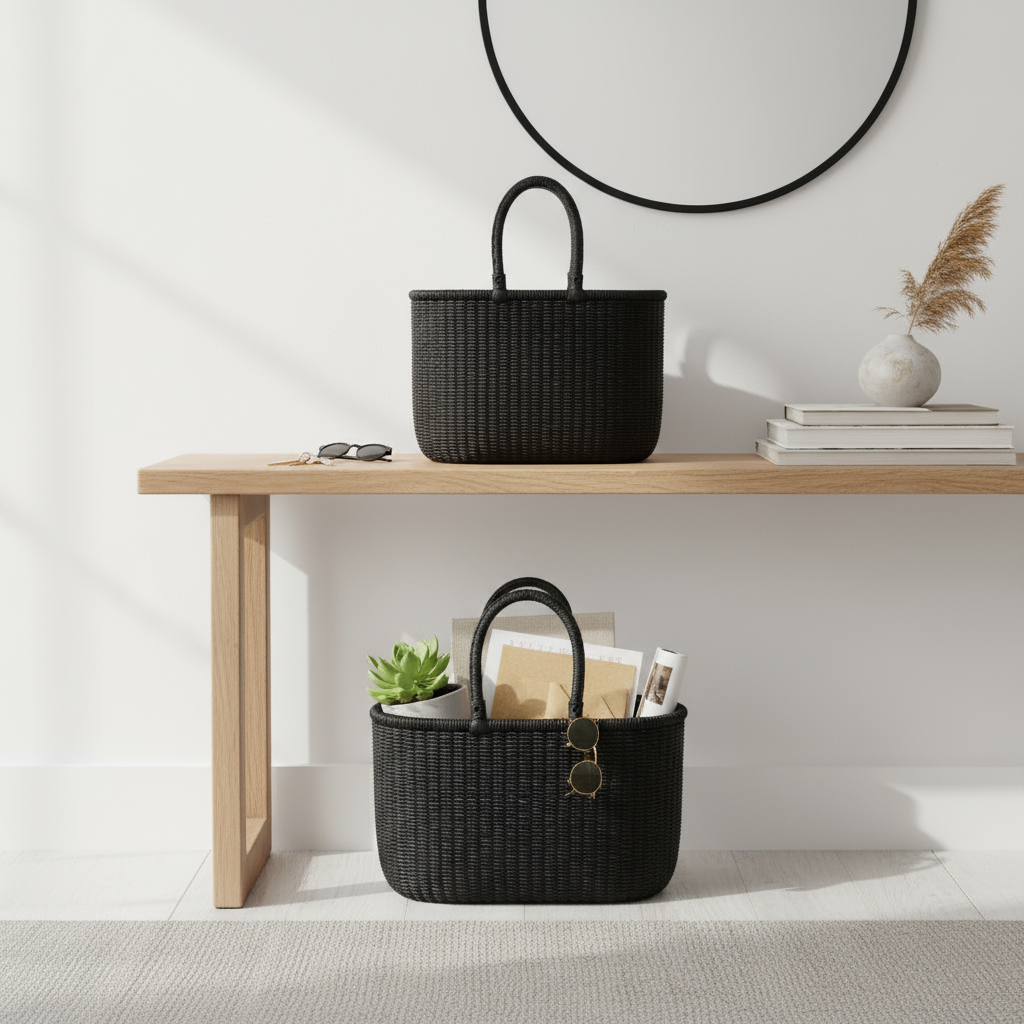 Originale ovale indkøbskurve er flettet af ghanesiske kvinder på danske Fair Trade vilkår.