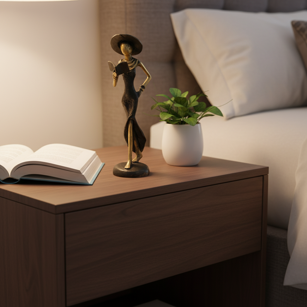 Kvinde med bog og hat – messingskulptur, sort kjole, str. 16 cm