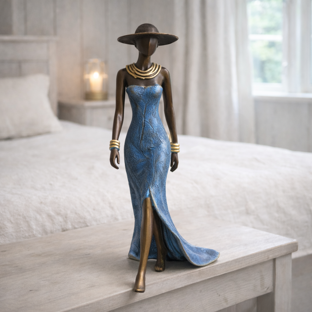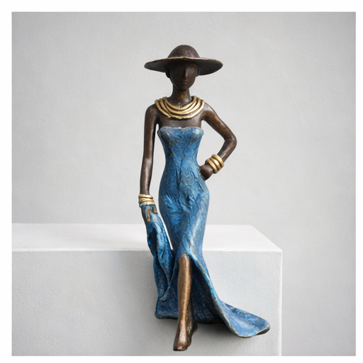 Kvinde med hat – bronze skulptur, blå kjole, str. 15 cm