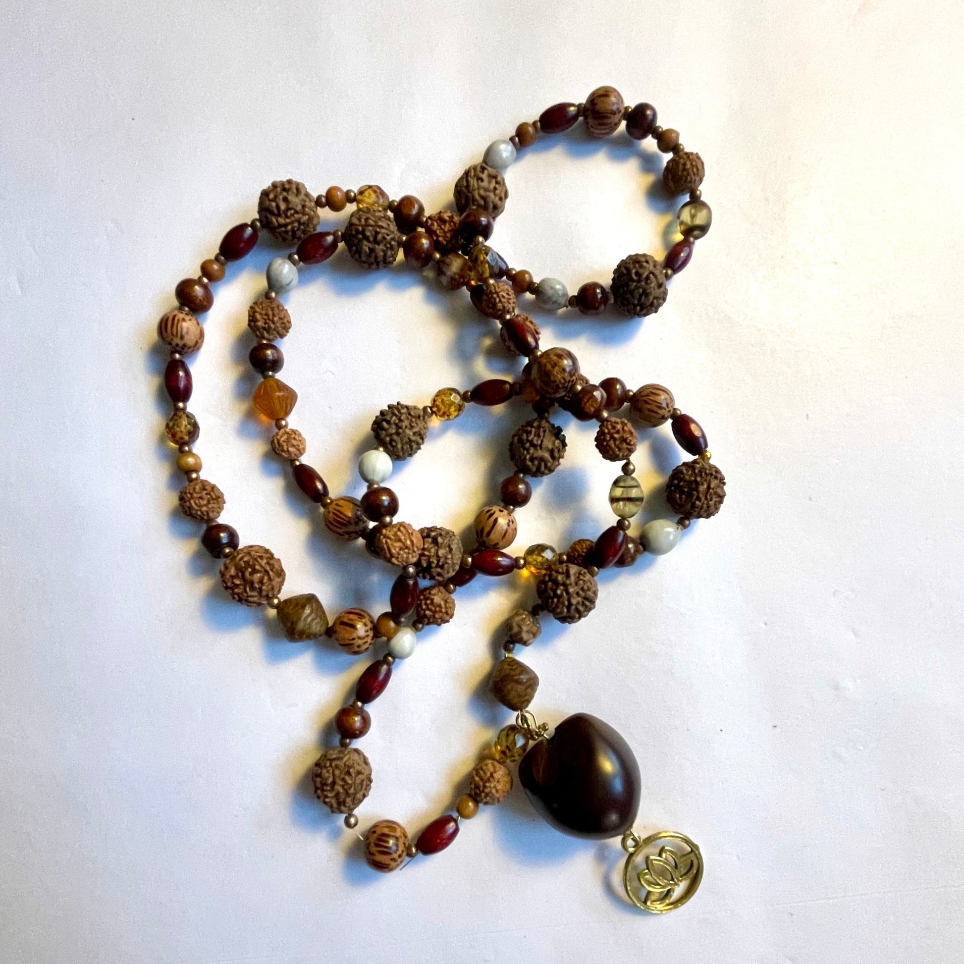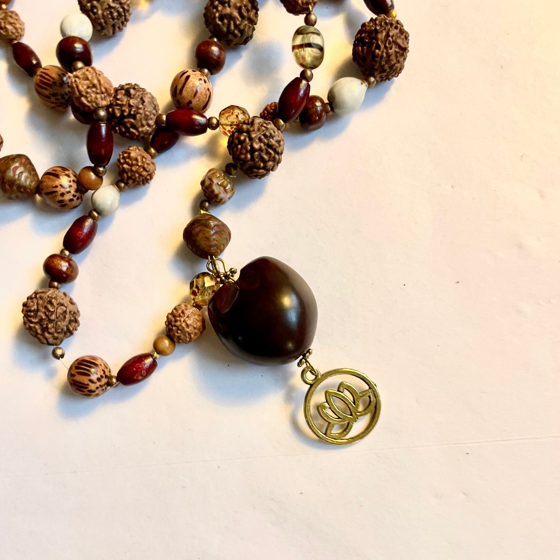 Mala perlekæde, jordfarver, træperler, nødder og halvædelsten med lotusblomst