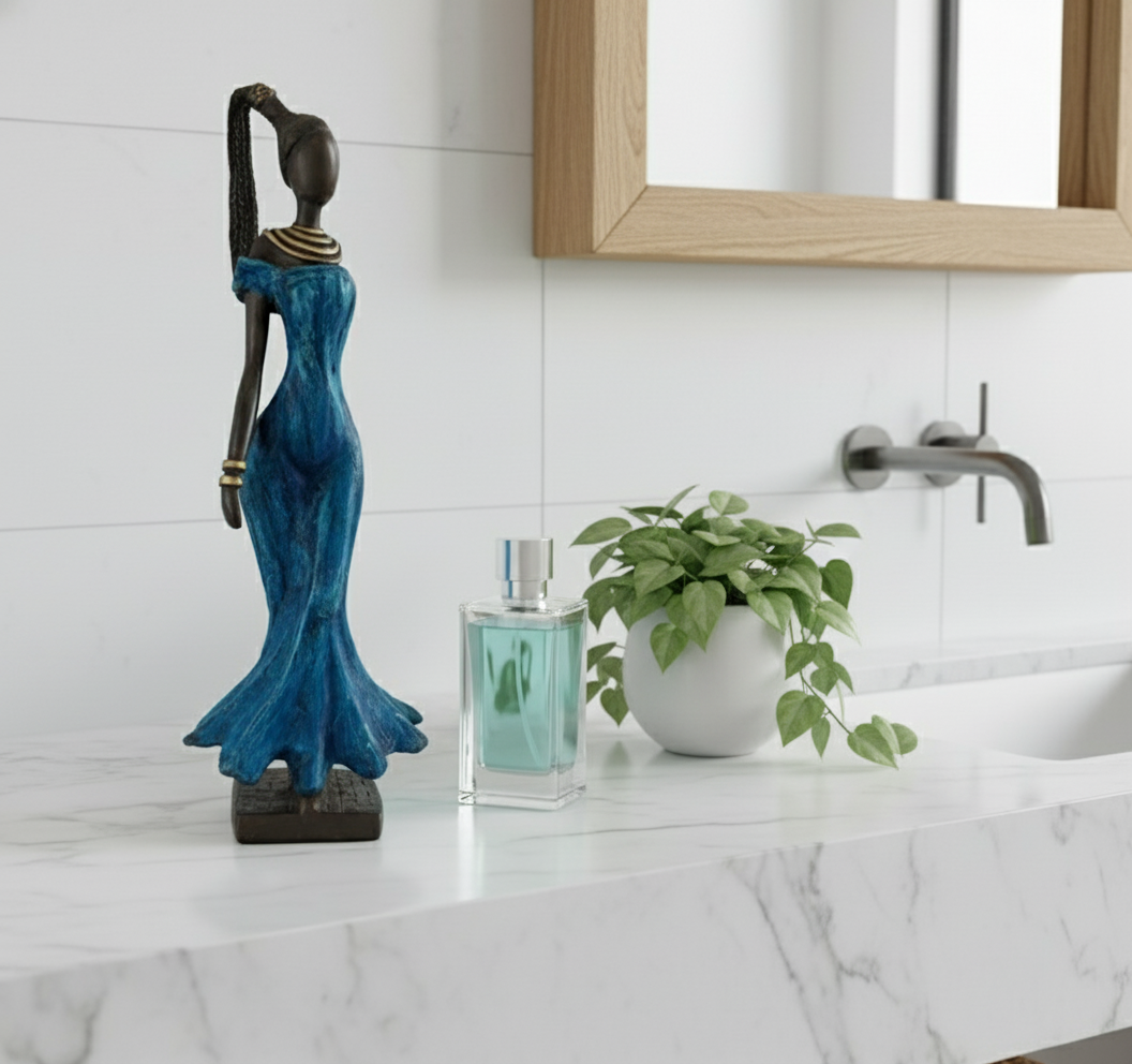 Messingkunst, 'Power Woman' i blå & langt hår, 35-37 cm, Fair Trade, Burkina Faso