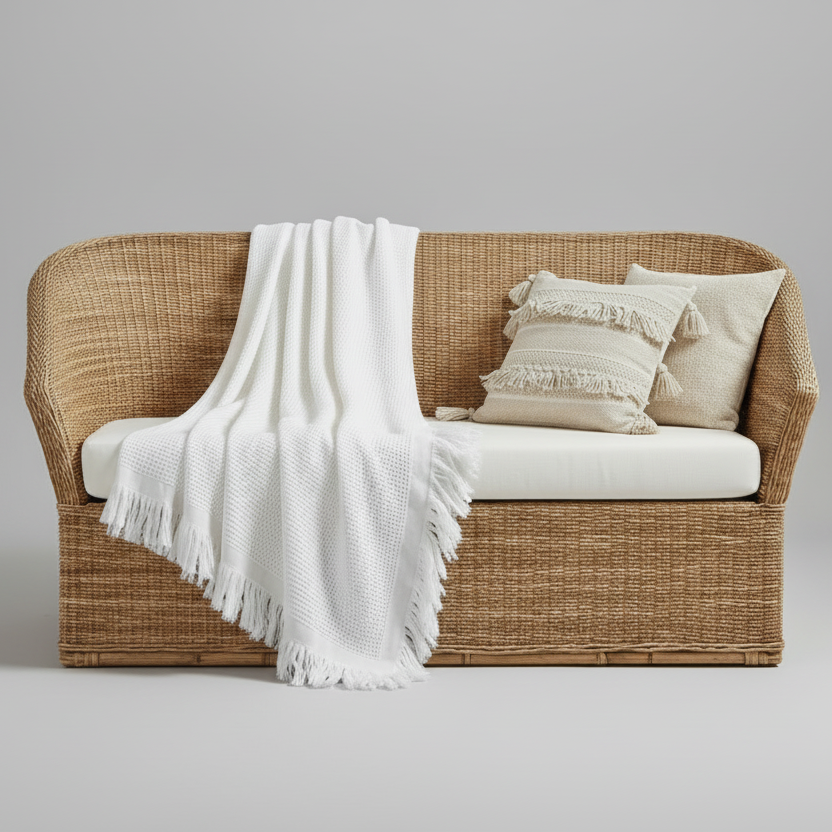 Et plaid med smukt bikubemønster, der forener funktionalitet og design. Den kan bruges som sofaplaid, tæppe, dug, let gulvtæppe eller dekorativt element – perfekt til at skabe hygge og stil i hjemmet.