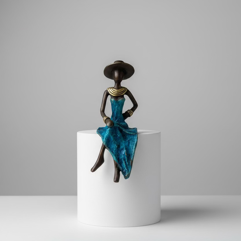 Siddende kvinde – bronzeskulptur, blå kjole, str. 15 cm