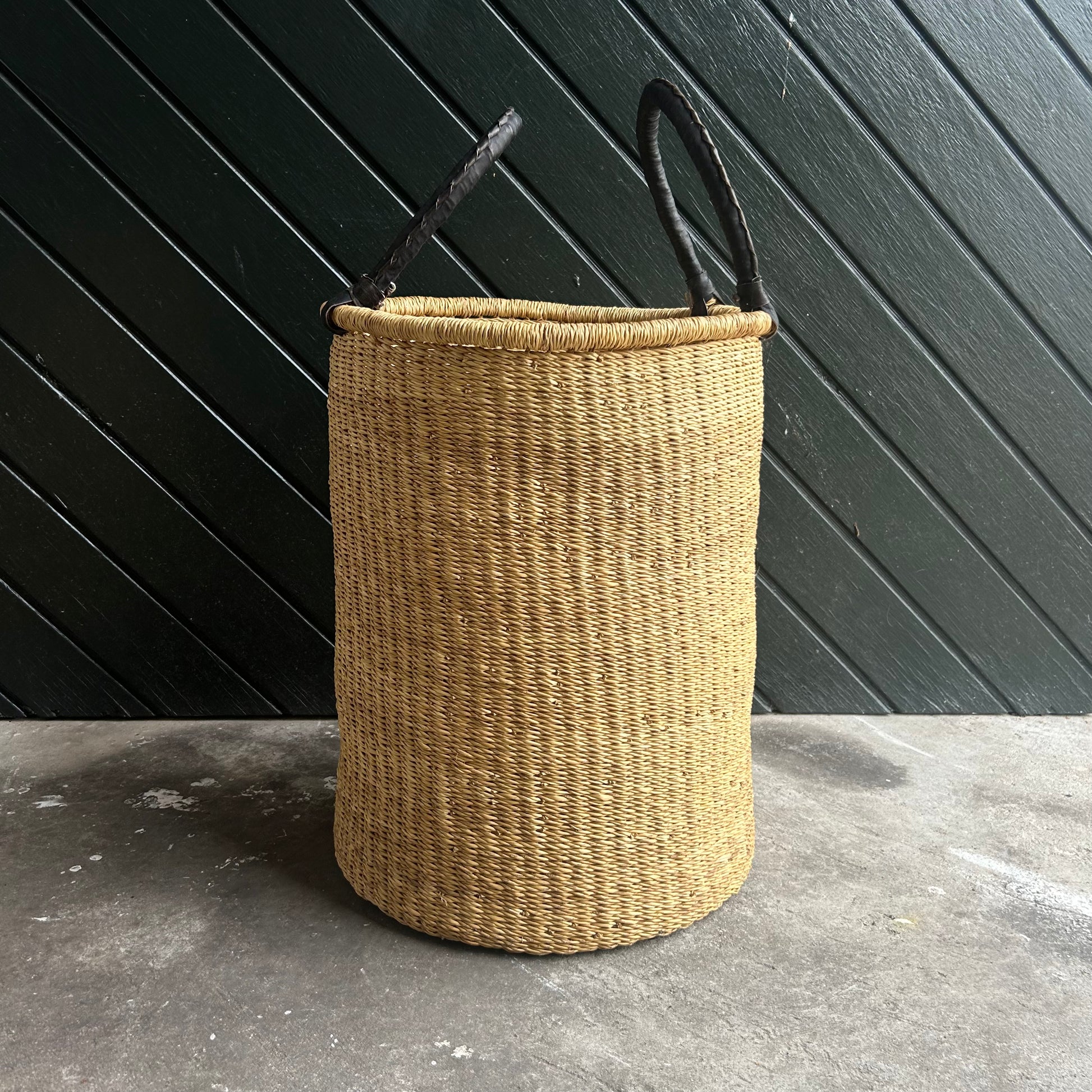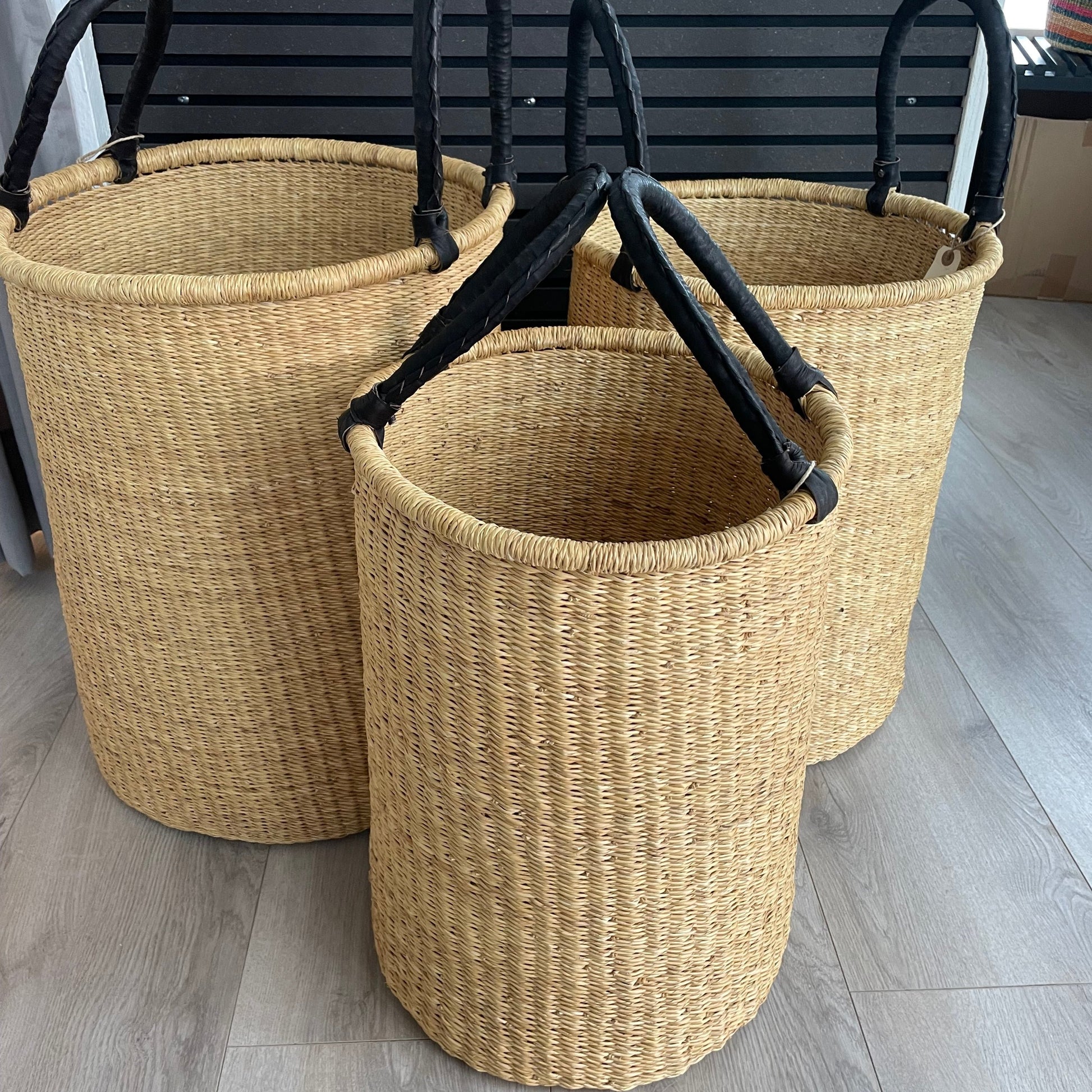 Tæt og stramt flettet i elefantgræs, så kurven ikke mister sin form over tid. De har sort skindhank. Tåler fugt. Kurvene er flettet af ghanesiske kvinder på danske Fair Trade vilkår.