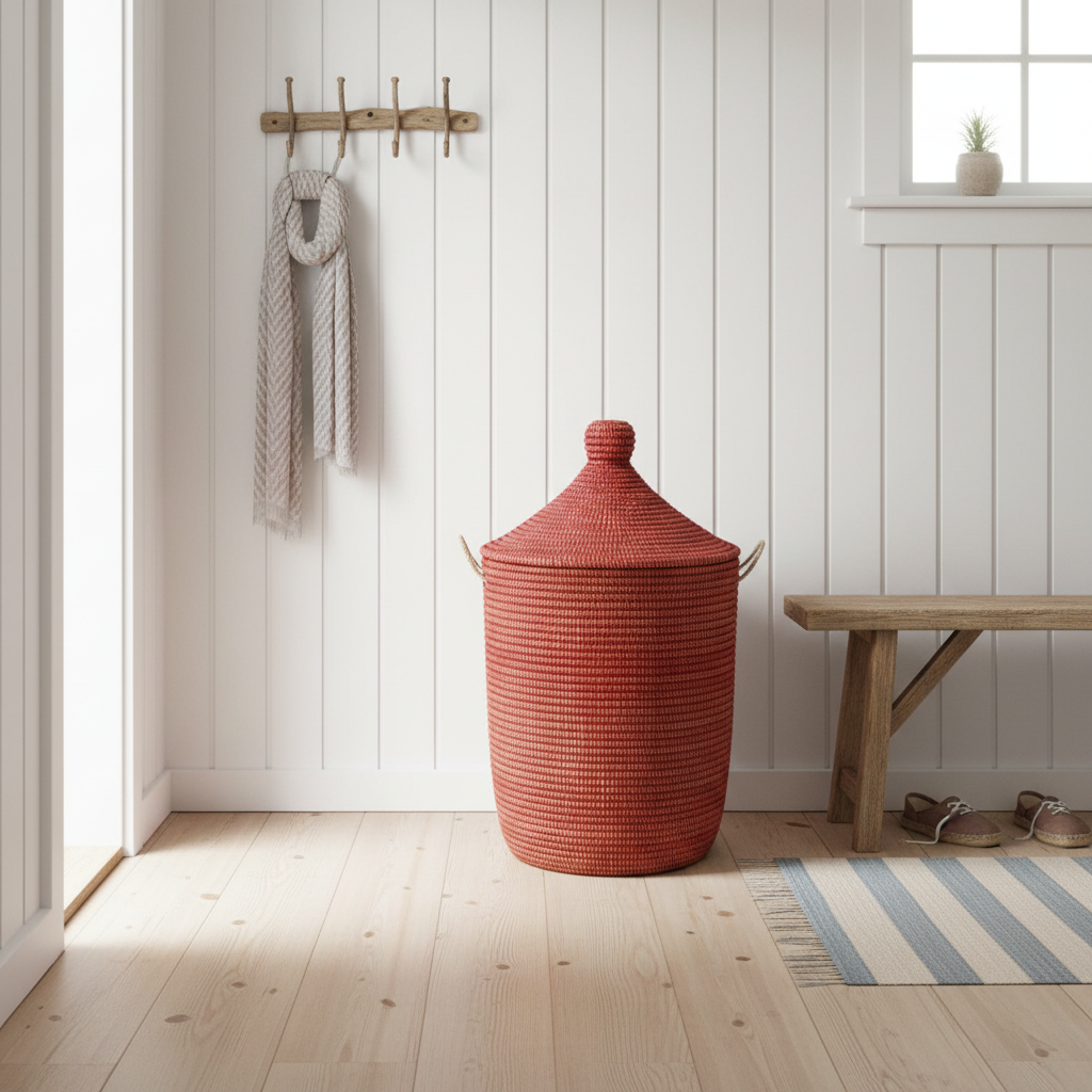 Rød vasketøjskurv med låg. Fair Trade, Senegal